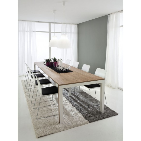 Le gambe sono in legno massiccio di faggio laccato bianco eventualmente decorata con inserto in laminato HPL della stessa finitura del piano.