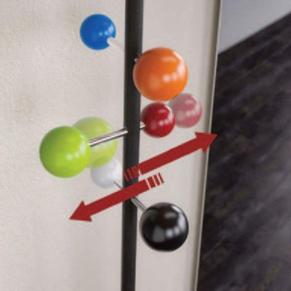 Altamente personalizzabile, è disponibile con pomoli multicolor o in legno di faggio, mentre top e base possono essere scelti in legno rivestito melaminico bianco oppure in massello di faggio naturale. L’asta è proposta in bianco o nero sablè, per adattarsi facilmente a interni moderni, contemporanei o più caldi e naturali.