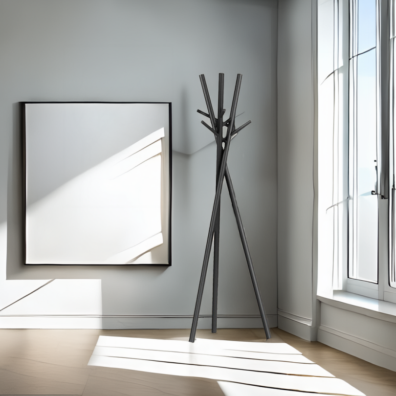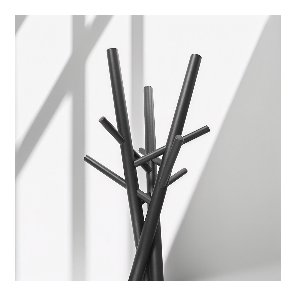 Realizzato in acciaio verniciato, la struttura è composta da tre elementi tubolari che, attraverso il sistema di incastro dei rami, danno vita a una forma autoportante stabile e resistente. Il design semplice e pratico si combina con una forte componente visiva, rendendo l'appendiabiti non solo utile, ma anche un vero e proprio elemento di stile che valorizza l'ingresso di qualsiasi ambiente.