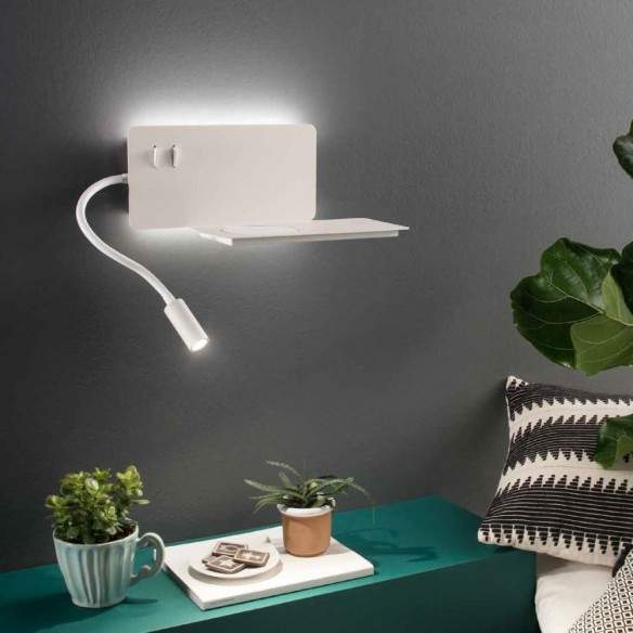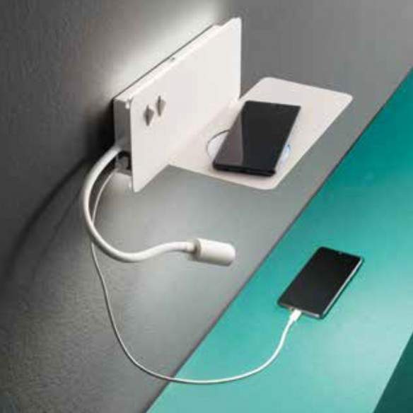 Un applique dal carattere moderno, tecnologico e versatile, ideale per chi desidera avere tutto a portata di mano in un unico elemento: luce d’ambiente, luce diretta e ricarica rapida per i propri dispositivi.