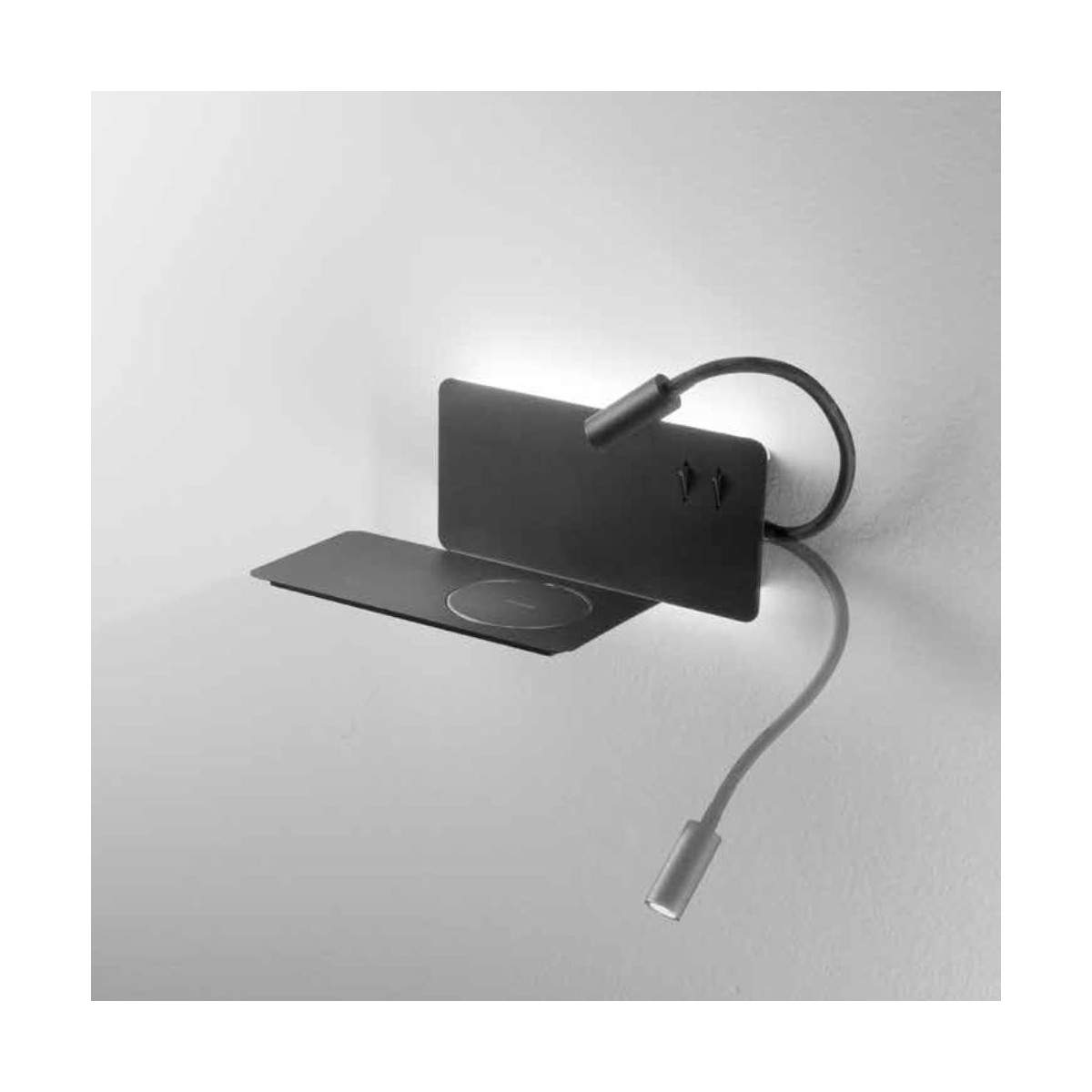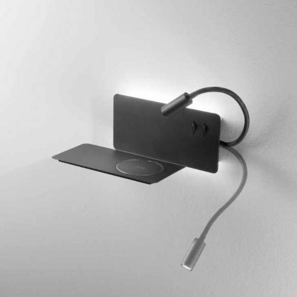 Un applique dal carattere moderno, tecnologico e versatile, ideale per chi desidera avere tutto a portata di mano in un unico elemento: luce d’ambiente, luce diretta e ricarica rapida per i propri dispositivi.