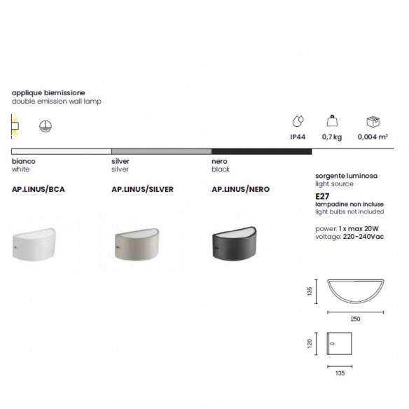Disponibile nei colori bianco, silver e nero, LINUS si adatta perfettamente a terrazzi, giardini e ingressi, valorizzando gli spazi esterni con un tocco elegante e contemporaneo. La sorgente luminosa LED assicura risparmio energetico e lunga durata.