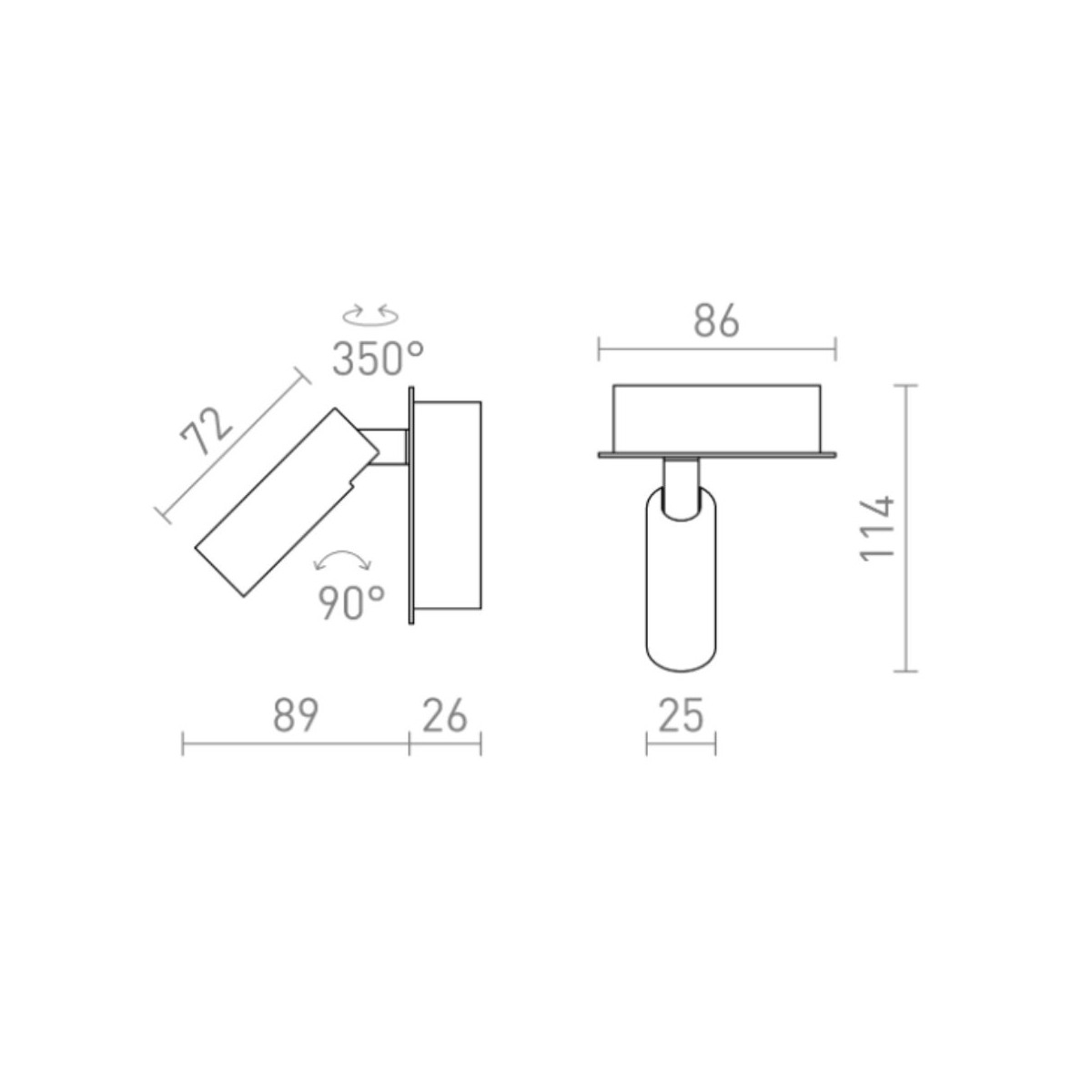 La struttura sottile, con soli 2,5 cm di diametro, 8,6 cm di altezza e 11,4 cm di lunghezza, permette di posizionarla facilmente anche in spazi contenuti. L’angolo di rotazione di 90° e l’inclinazione di 350° consentono di orientare la luce con precisione, mentre l’interruttore integrato ne facilita l’uso quotidiano. Il cavo può essere fissato con il pratico manicotto presente sulla base, rendendo MIG elegante e versatile per la zona notte.