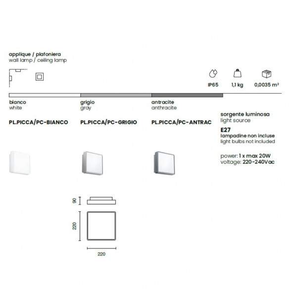 Plafoniera o applique PICCA per esterni, struttura in ABS e diffusore in policarbonato.