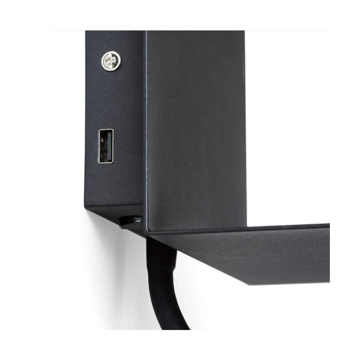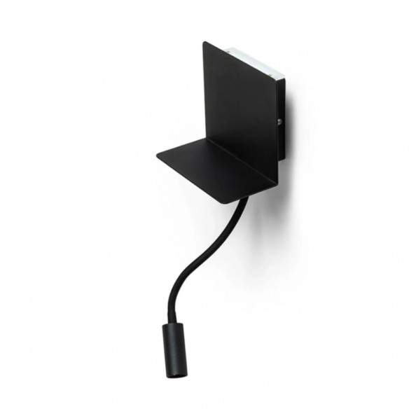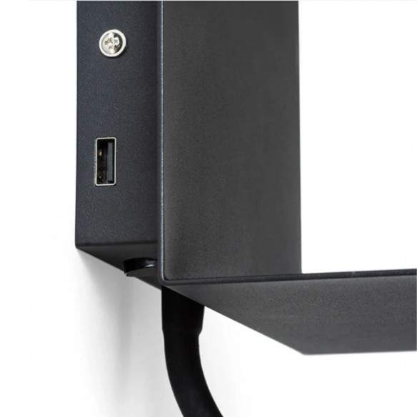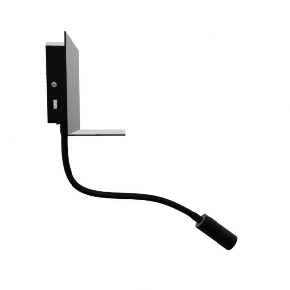 Applique ROSTAM a LED da parete con mensoletta per cellulare e porta USB integrata. Faretto LED su collo flessibile e luce indiretta sono regolabili autonomamente da due interruttori.
