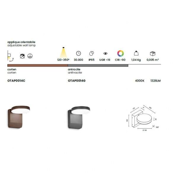 Proposta nelle raffinate finiture corten e antracite, integra una sorgente LED ad alta efficienza, garanzia di consumi ridotti e lunga durata.
