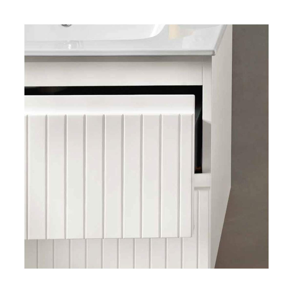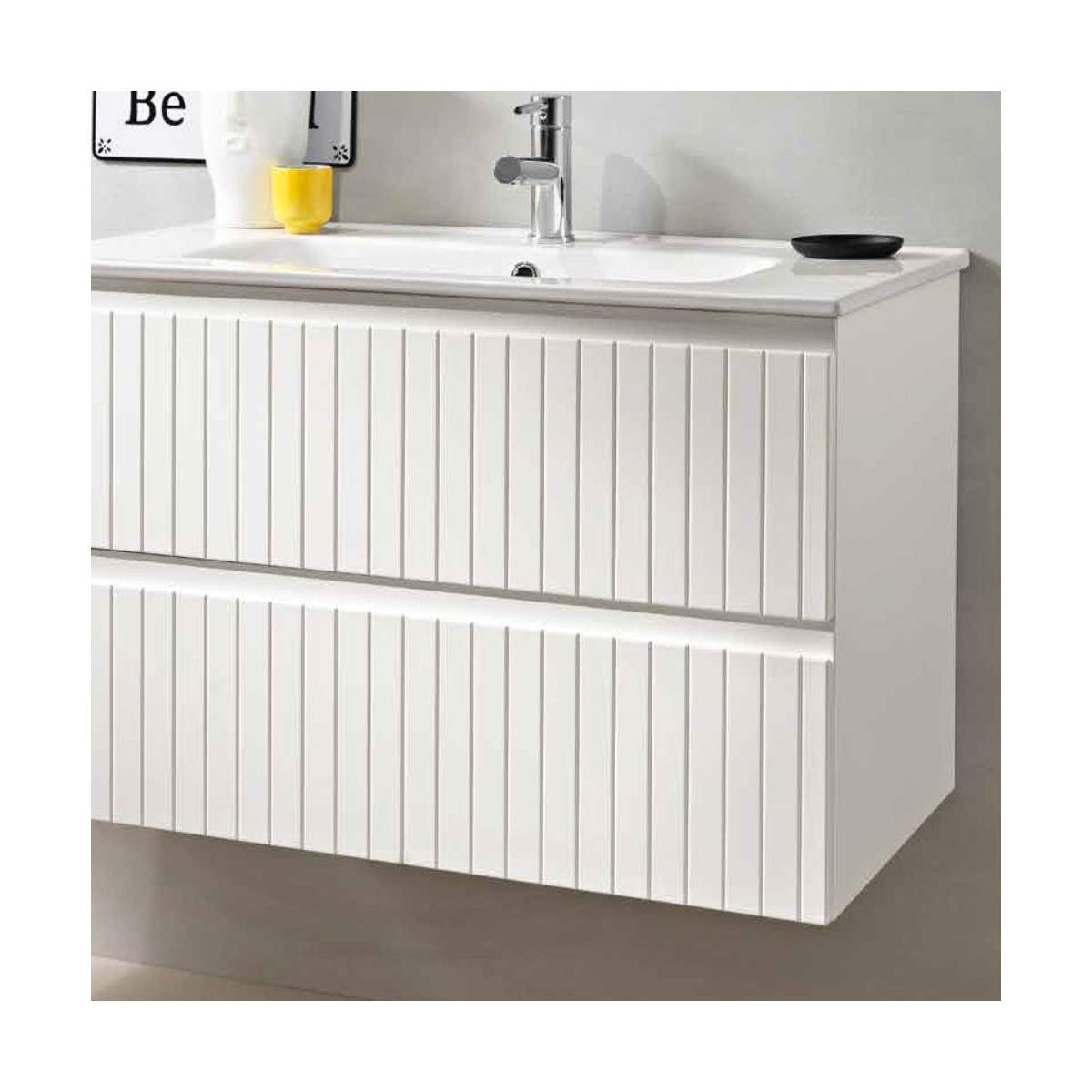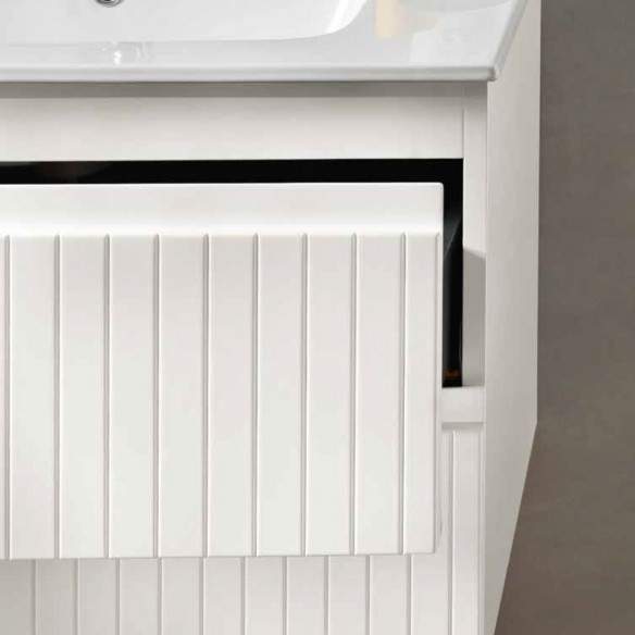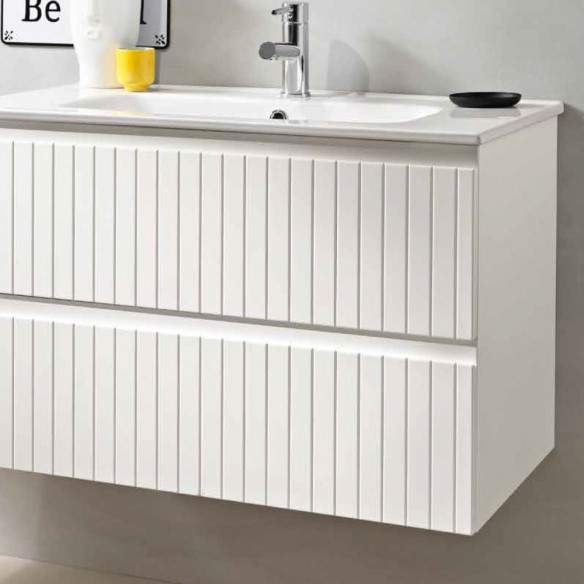 La base può essere abbinata a diverse soluzioni: un top di chiusura in MDF con lavabo da appoggio, senza fori predefiniti per la massima libertà di posizionamento; un lavabo da incasso in ceramica o mineralmarmo lucido; oppure un top scatolato in mineralmarmo opaco con lavabo integrato senza foro per rubinetto.