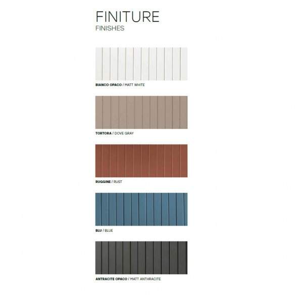 Disponibile in Bianco opaco, Tortora, Ruggine, Blu e Antracite opaco, per adattarsi perfettamente a qualsiasi stile d’arredo.