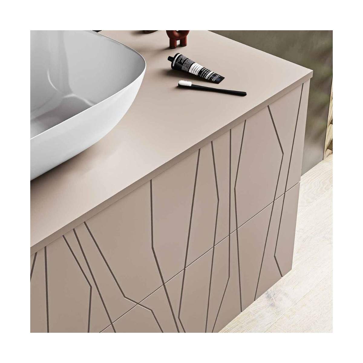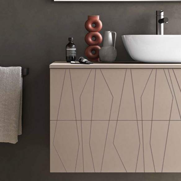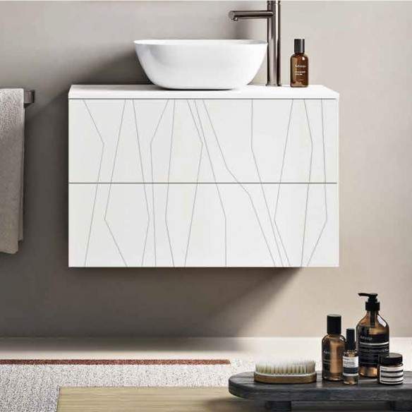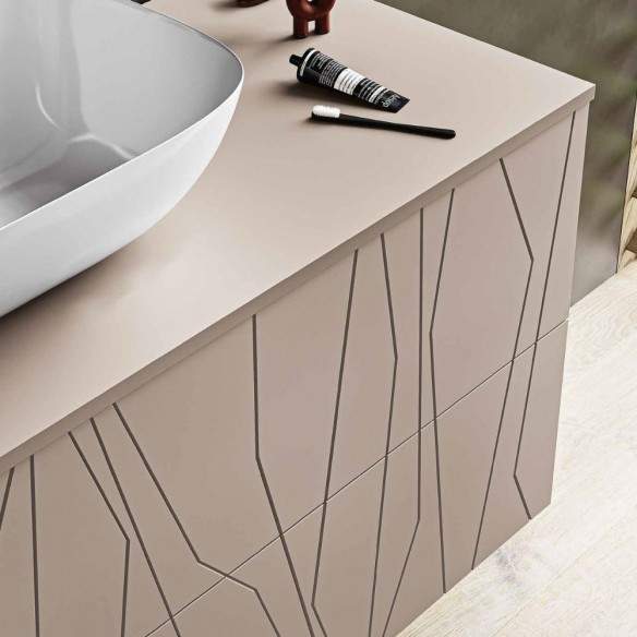 Top di chiusura in MDF con lavabo da appoggio, privo di fori predefiniti per la massima libertà di posizionamento del lavabo.