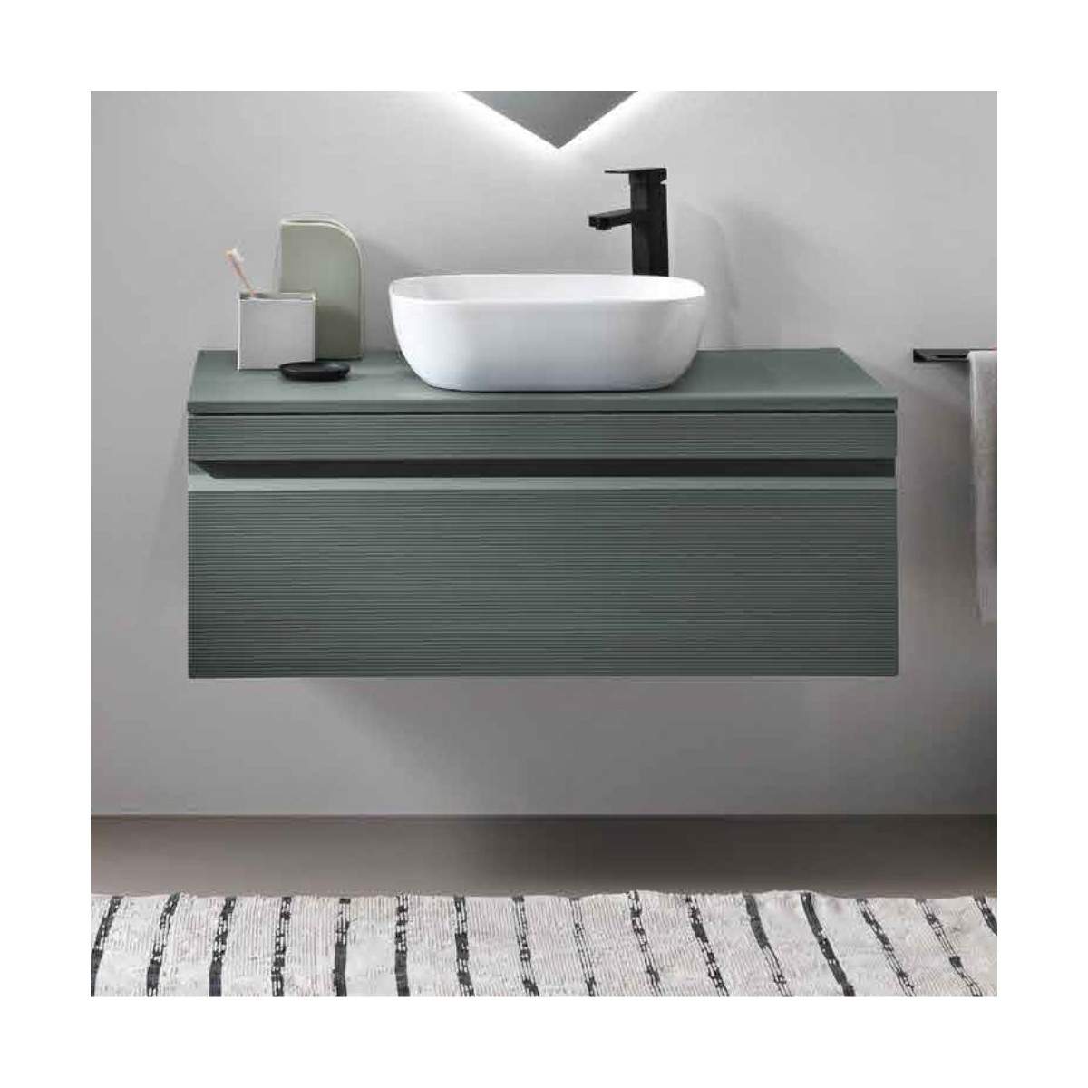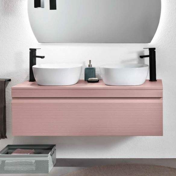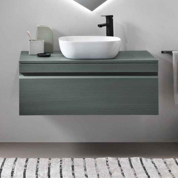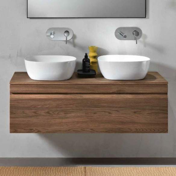La base è disponibile in tre misure ed è combinata con lavabo da appoggio in ceramica.