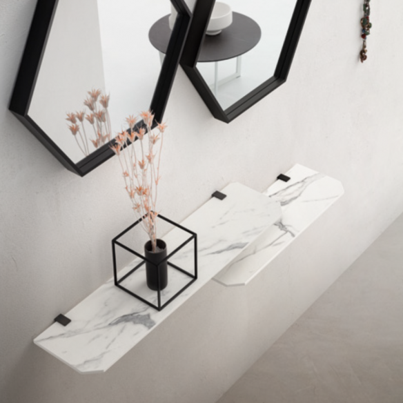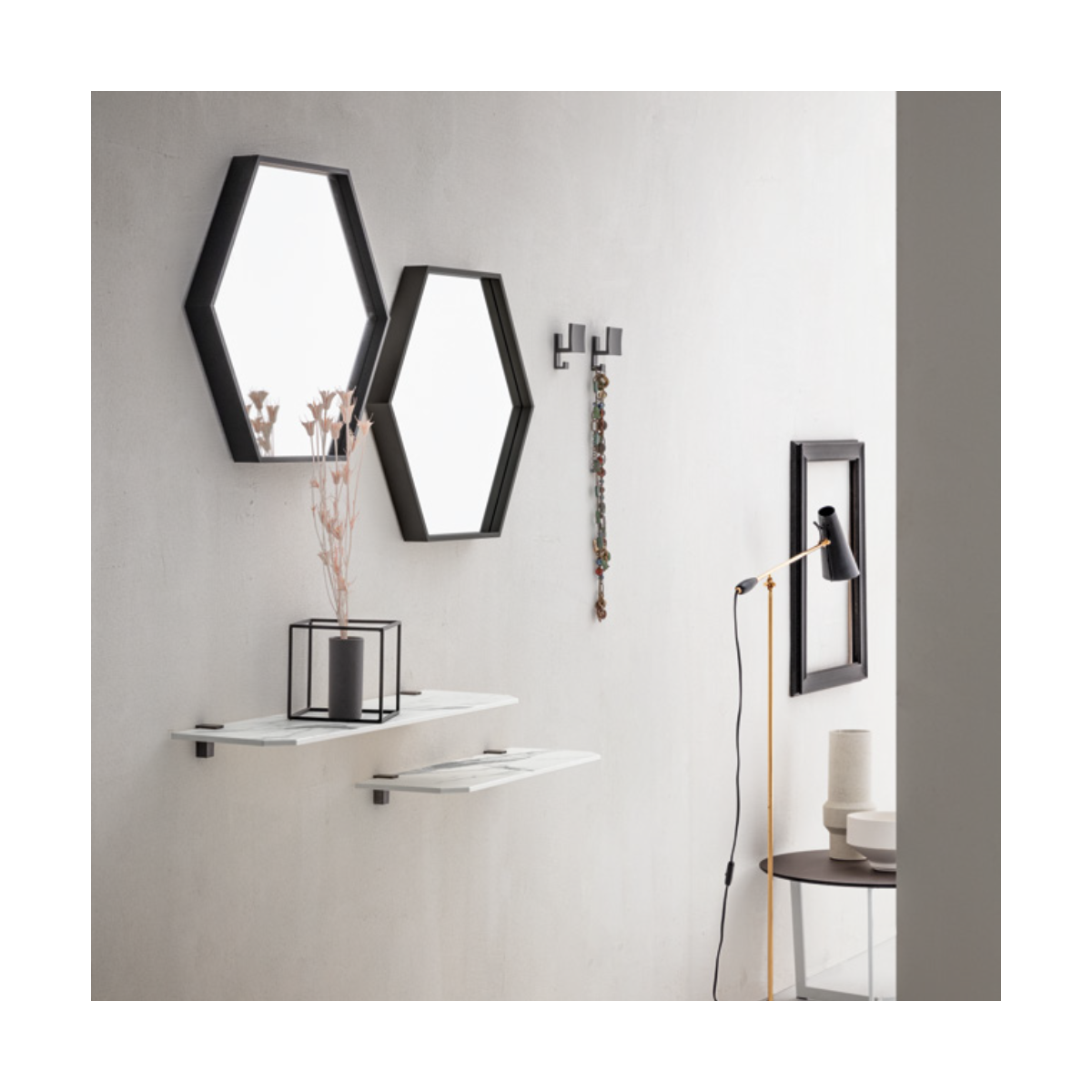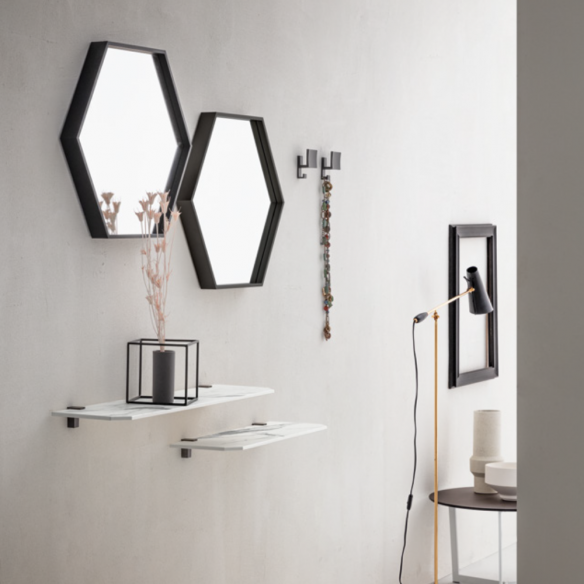 Composizione CROSS 751 composta da due specchi esagonali con telaio in alluminio neri, due mensole in bianco statuario e appendini nero opaco.