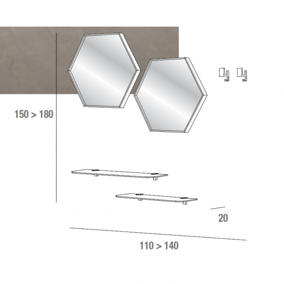 Questa composizione si distingue per i due specchi esagonali, impreziositi da un sottile telaio in alluminio nero opaco, che creano un piacevole gioco geometrico sulle pareti, riflettendo la luce e ampliando visivamente l’ambiente.