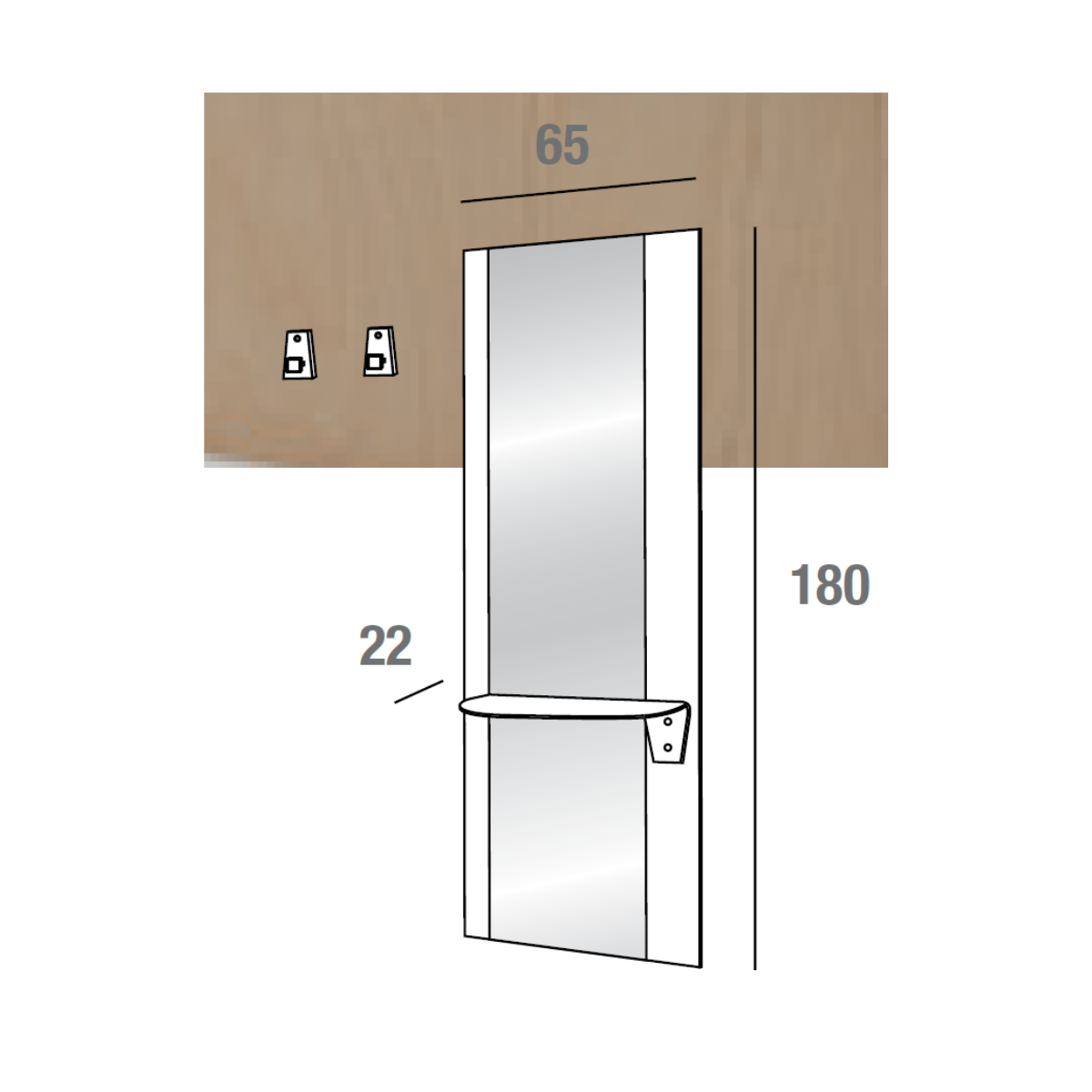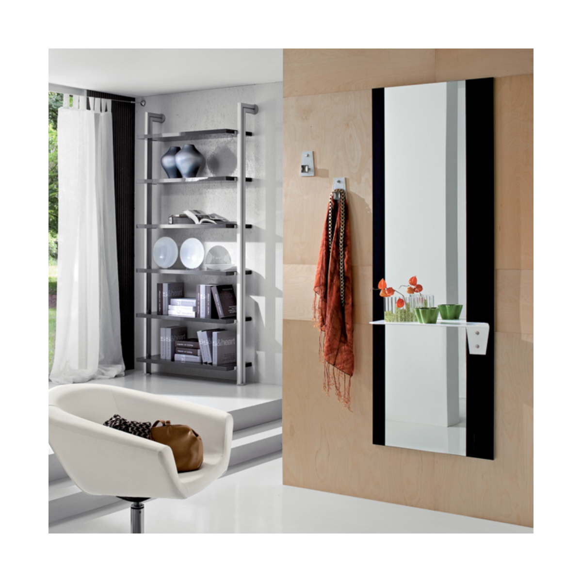 Lo specchio, con bordi in vetro nero e fori integrati per l’inserimento della mensola, dona profondità e personalità alla parete, creando un raffinato contrasto tra luce e materia. Ogni dettaglio è studiato per valorizzare anche gli spazi più contenuti, offrendo una soluzione d’arredo compatta ma dal grande impatto visivo.