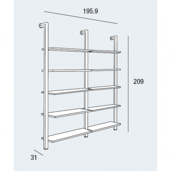Questa libreria si distingue per la sua struttura leggera e raffinata, composta da montanti sottili in metallo finitura moka, un colore scuro e intenso che regala profondità allo spazio e si abbina con facilità sia a toni chiari sia a palette più calde o industrial. I montanti verticali sostengono con slancio le ampie mensole, creando un piacevole gioco di pieni e vuoti che dona ariosità e luminosità all’ambiente.