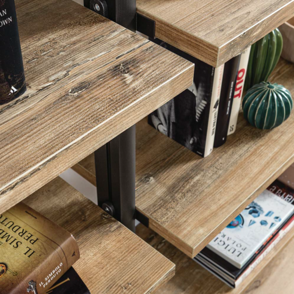 Libreria NATASHA 720 con montanti in metallo verniciato moka e mensole in hpl in finitura rovere slavonia.