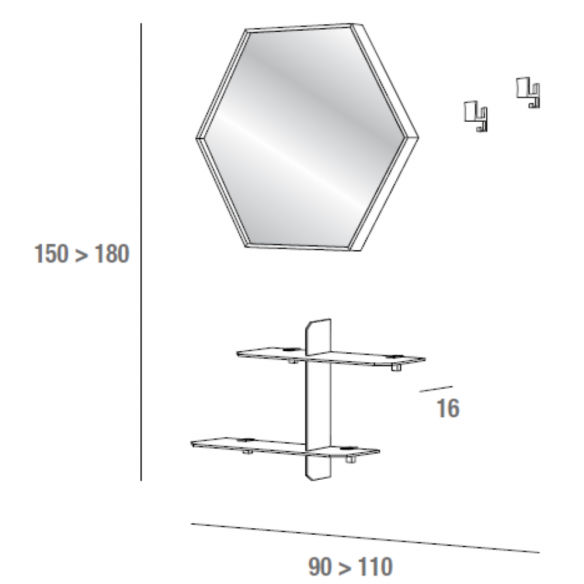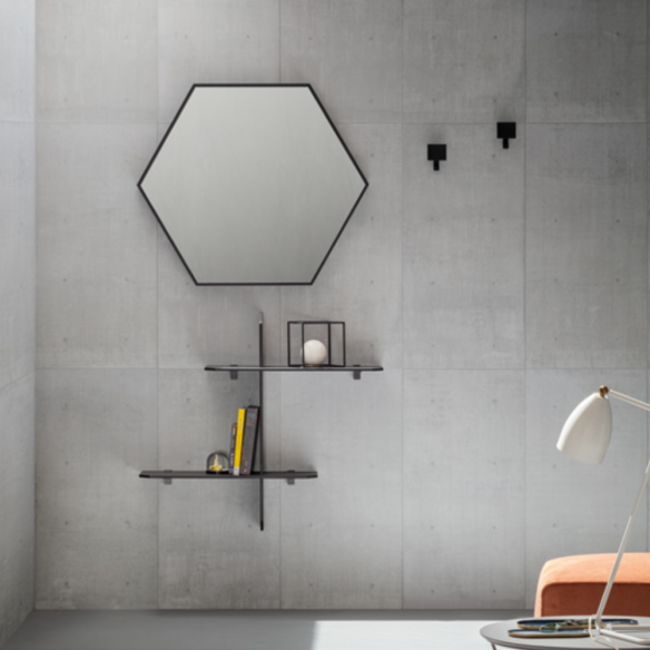 Essenziale nelle forme ma ricca di carattere, la composizione CROSS 752 ridefinisce l’ingresso con un gusto contemporaneo e materico. Il protagonista è lo specchio esagonale, incorniciato da un sottile telaio in alluminio nero opaco, che gioca con la luce ampliando la percezione dello spazio e donando un tocco grafico alla parete.