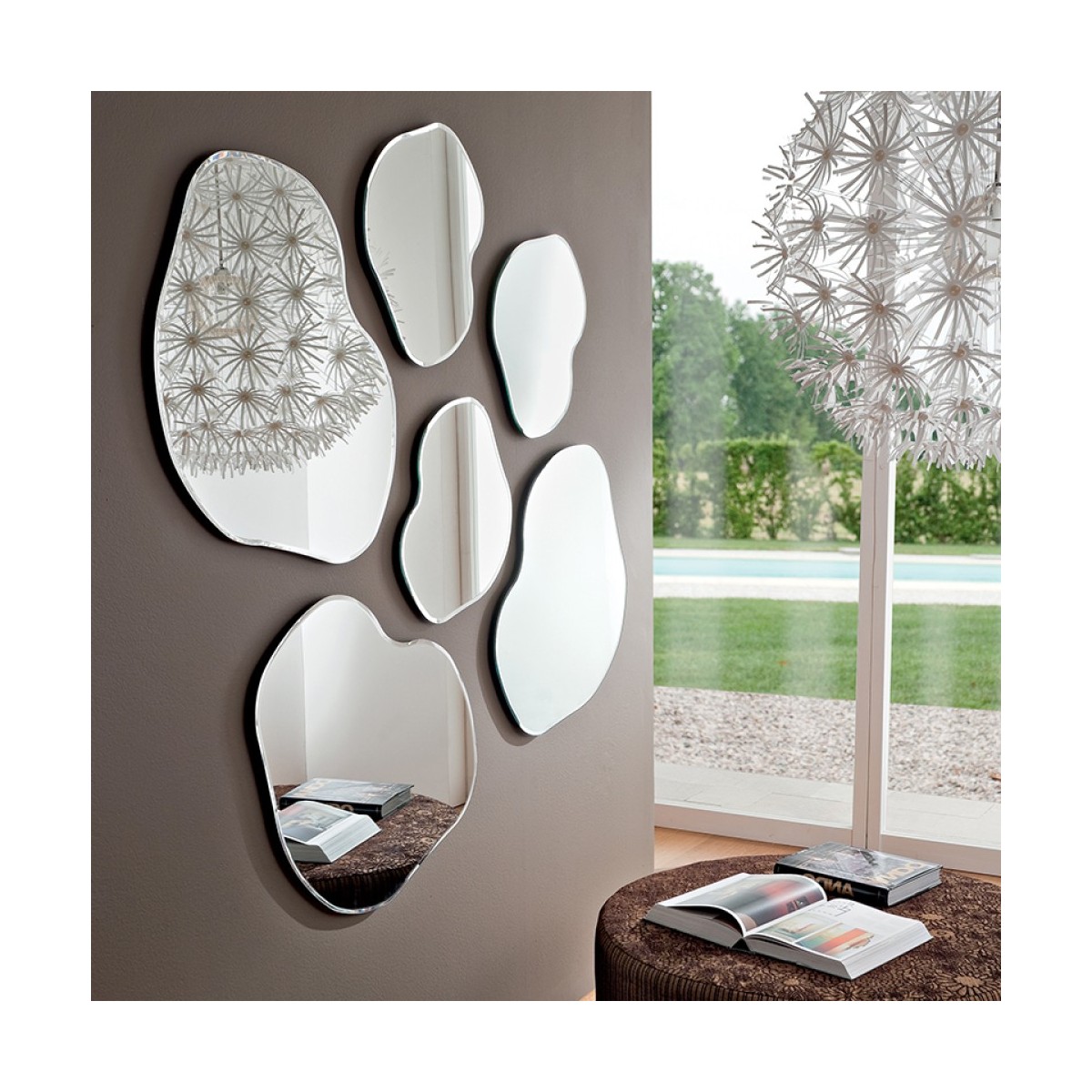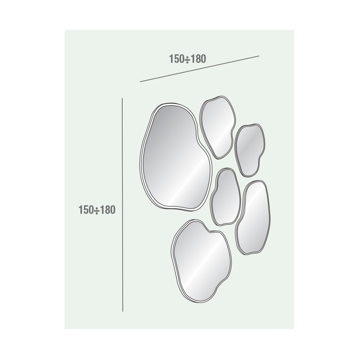 Il bisello, con la sua lavorazione raffinata, cattura e frammenta la luce, regalando riflessi delicati e preziosi che donano profondità e movimento alla parete. La disposizione dei sei specchi, studiata con cura, rompe la monotonia delle superfici lisce e aggiunge un tocco contemporaneo, elegante e dinamico a qualsiasi stanza.