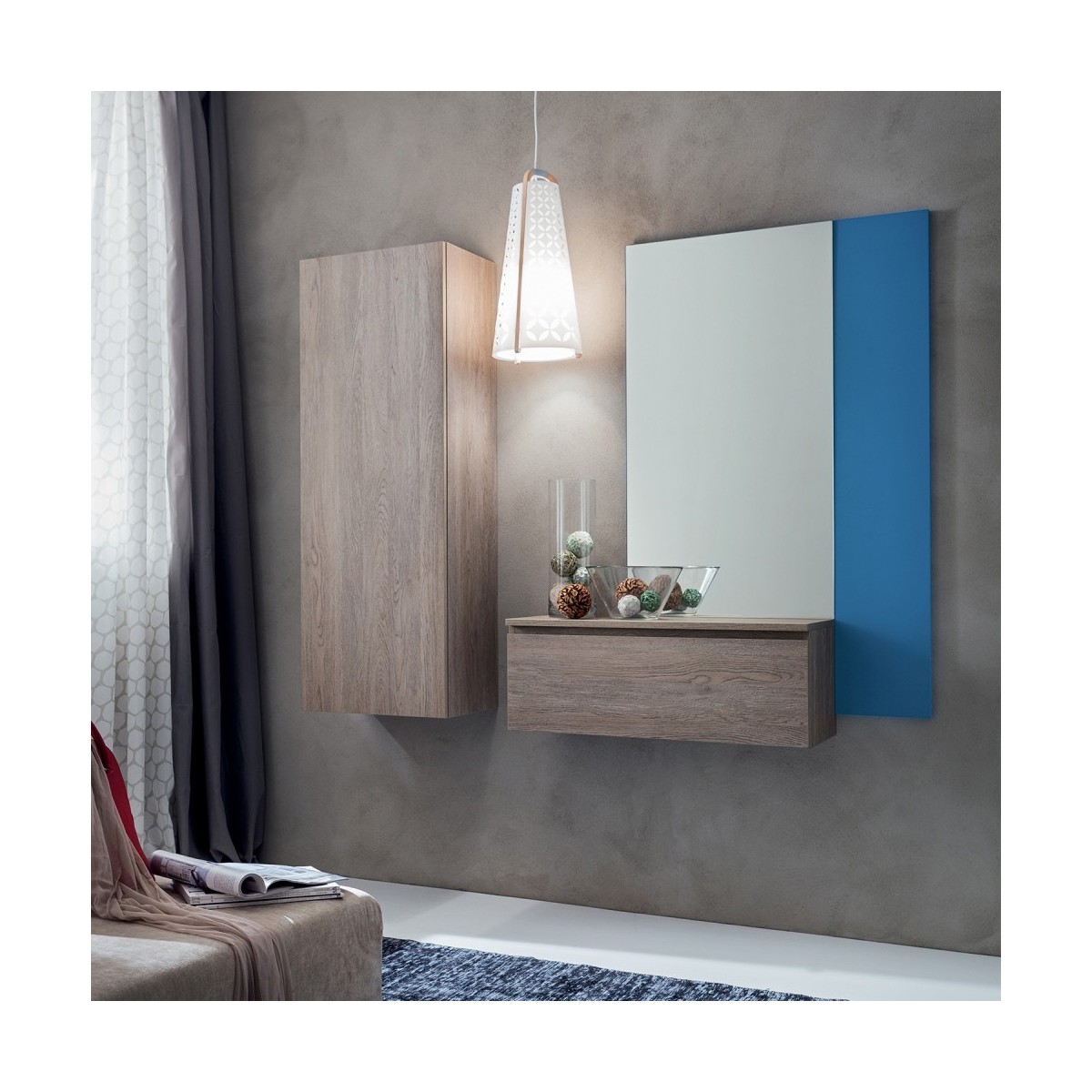 L’armadio gessato grigio (50x138 cm) è il cuore della composizione: il suo design elegante e compatto lo rende ideale per ambienti di diverse dimensioni, mentre la finitura gessata grigia aggiunge un tocco di raffinatezza senza essere troppo invasivo. Lo specchio grande blu completa l’insieme, non solo riflettendo la luce e creando un senso di maggiore ampiezza, ma aggiungendo anche un accento di colore che ravviva la stanza.