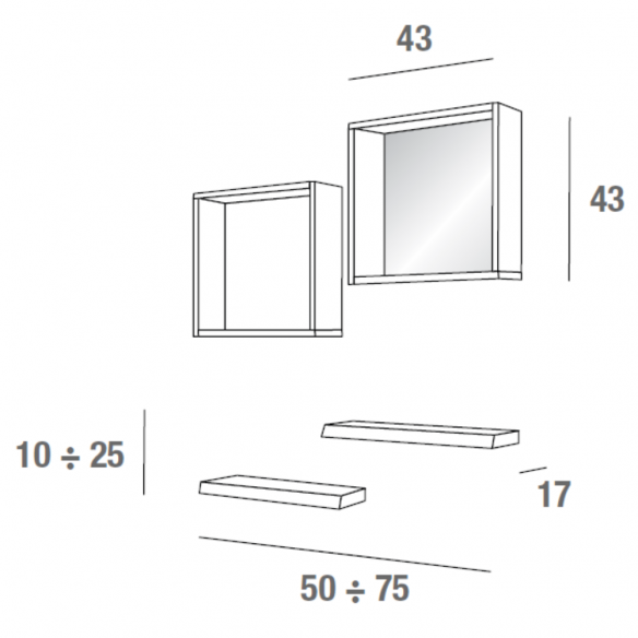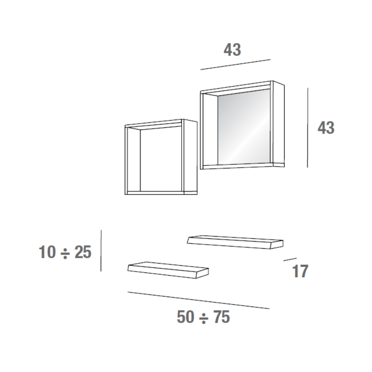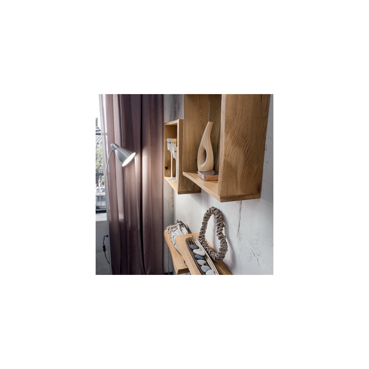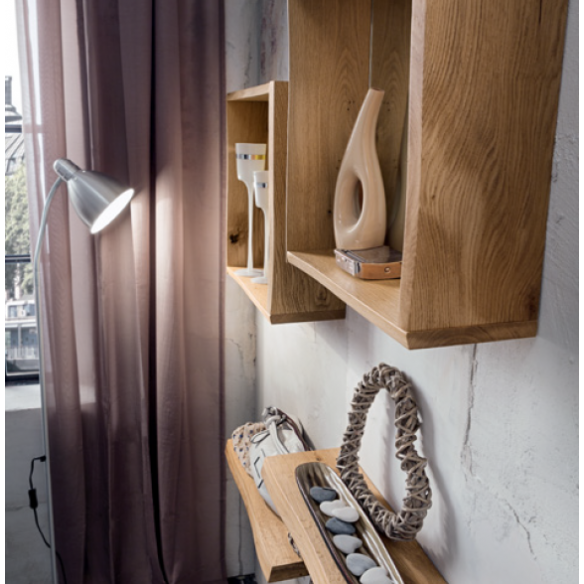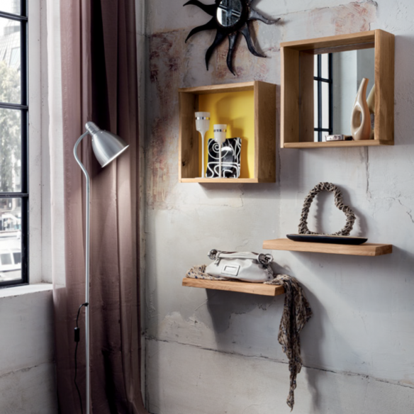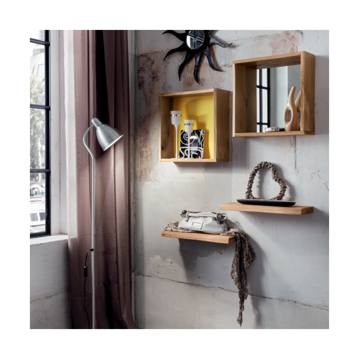 Il contenitore a giorno in rovere e giallo è perfetto per esporre oggetti decorativi o sistemare piccoli accessori, mentre il secondo contenitore con specchio non solo aggiunge un elemento di design, ma amplifica visivamente lo spazio, rendendo l’ambiente più luminoso e arioso. A completare la composizione, le mensole scortecciate in rovere offrono una soluzione pratica per riporre o esporre oggetti in modo elegante e naturale.