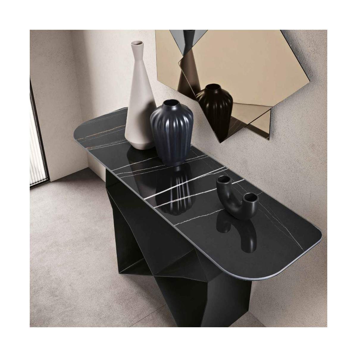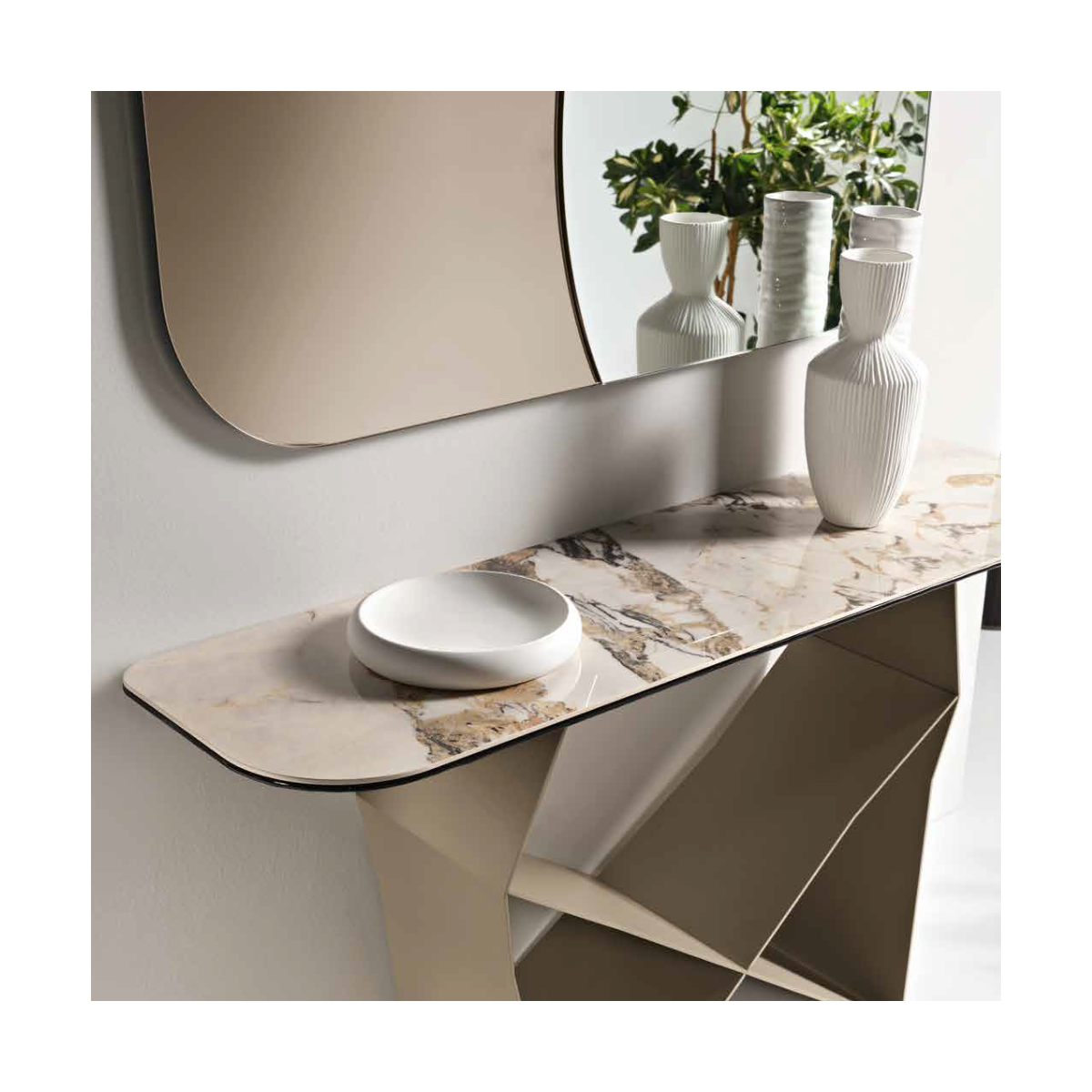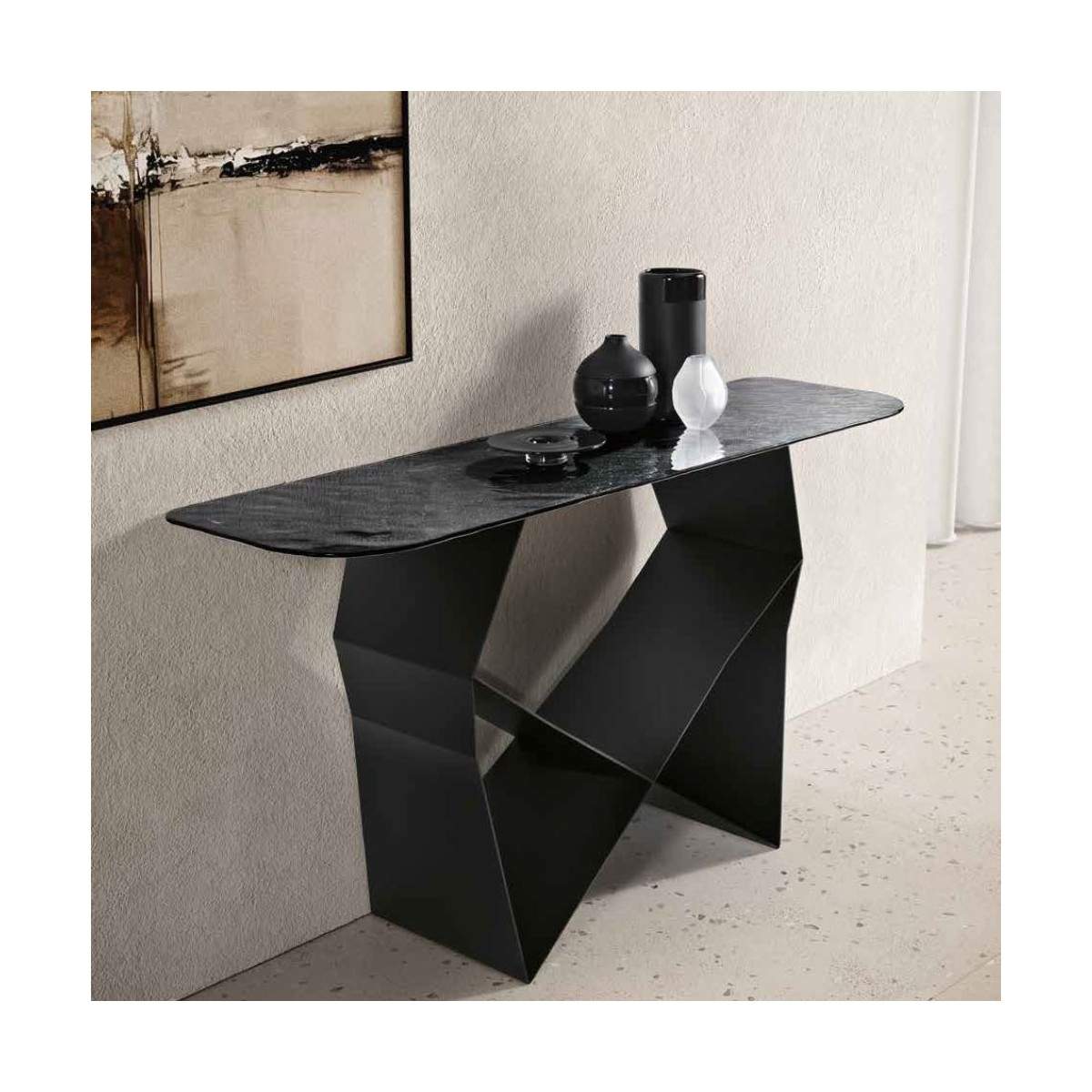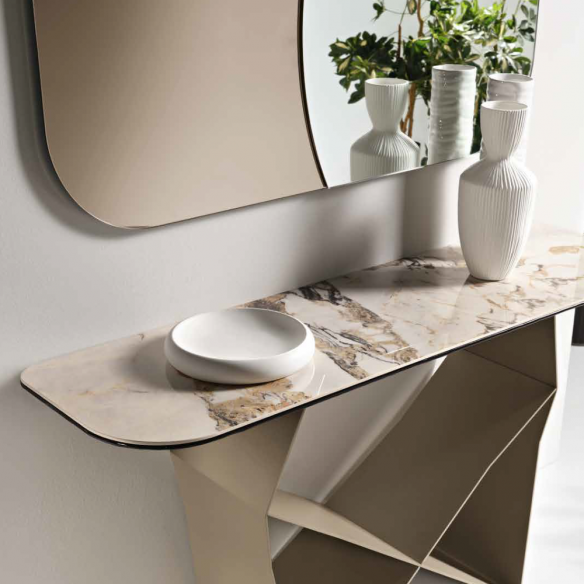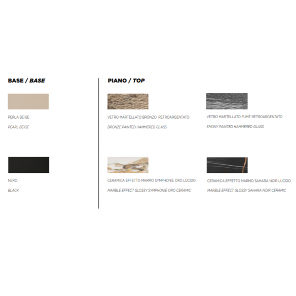 Consolle con base in metallo verniciato nero o perla beige. Piano in due versioni: vetro martellato retroargentato o ceramica effetto marmo stratificata su vetro.
