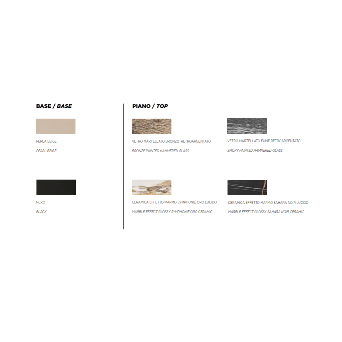 La base in metallo verniciato, disponibile nelle sofisticate tonalità nero o perla beige, conferisce alla Consolle DELFI una solidità duratura e un'estetica contemporanea. Il piano della consolle offre due varianti di materiali di pregio: vetro martellato retroargentato e ceramica effetto marmo stratificata su vetro. Il vetro martellato retroargentato riflette la luce in modo affascinante, creando un'atmosfera luminosa e accogliente. La ceramica effetto marmo, invece, dona un aspetto lussuoso e moderno, ideale per ambienti eleganti e ricercati.
