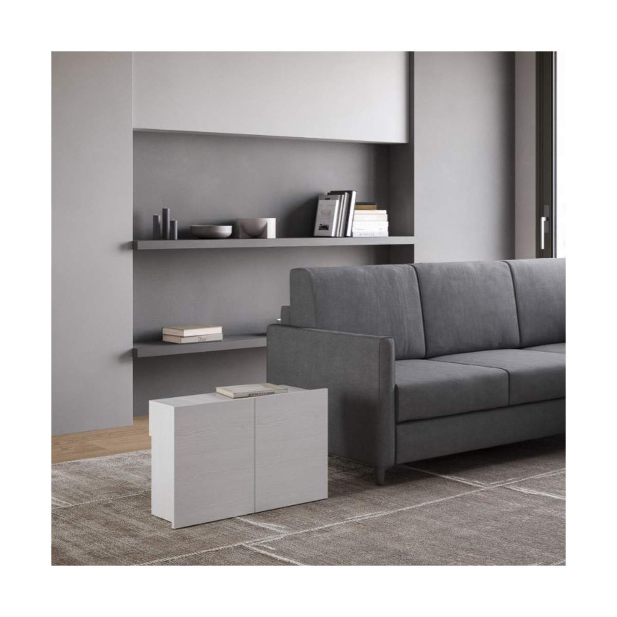 Con EVOLVE con panca, porti in casa un arredo trasformabile, intelligente e dal design impeccabile, perfetto per chi vuole vivere lo spazio in modo flessibile e raffinato.