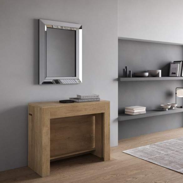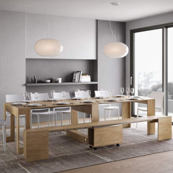 Compatta nelle dimensioni da chiusa (90 cm di larghezza, 42 cm di profondità e 75 cm di altezza), si trasforma con facilità in un ampio tavolo da pranzo, grazie a un sistema di estensione che permette di raggiungere i 302 cm di lunghezza.