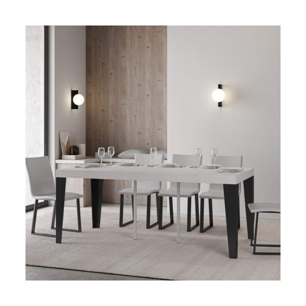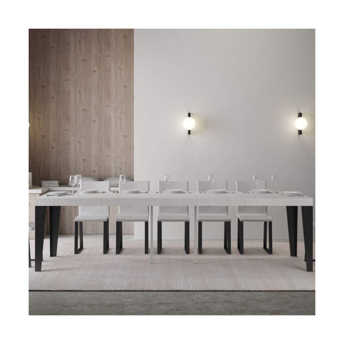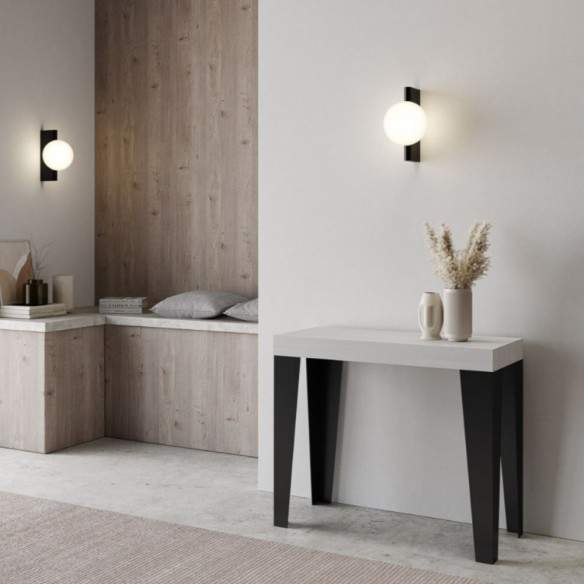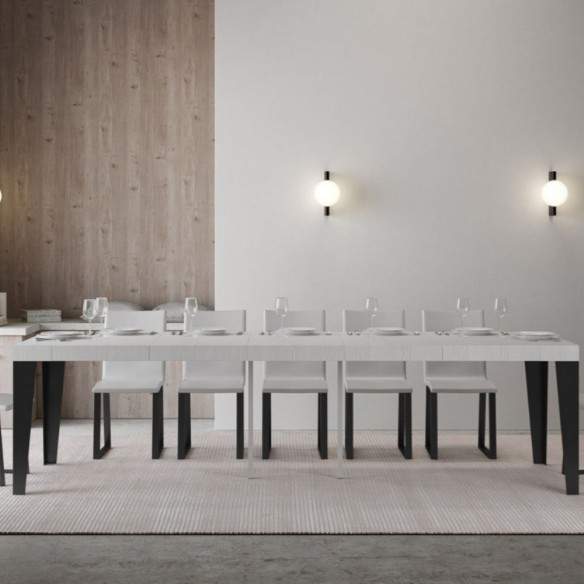 Compatta nelle dimensioni (90x40 cm, altezza 77 cm), si trasforma con semplicità in un ampio tavolo lungo fino a 300 cm, perfetto per accogliere amici e famiglia o per adattarsi a situazioni di lavoro e studio.