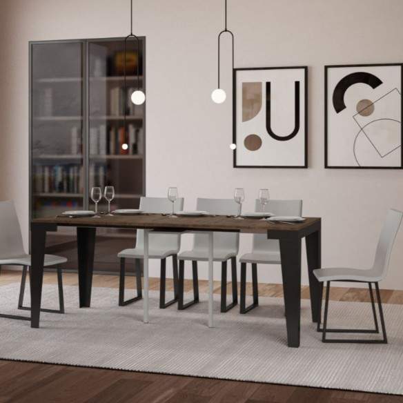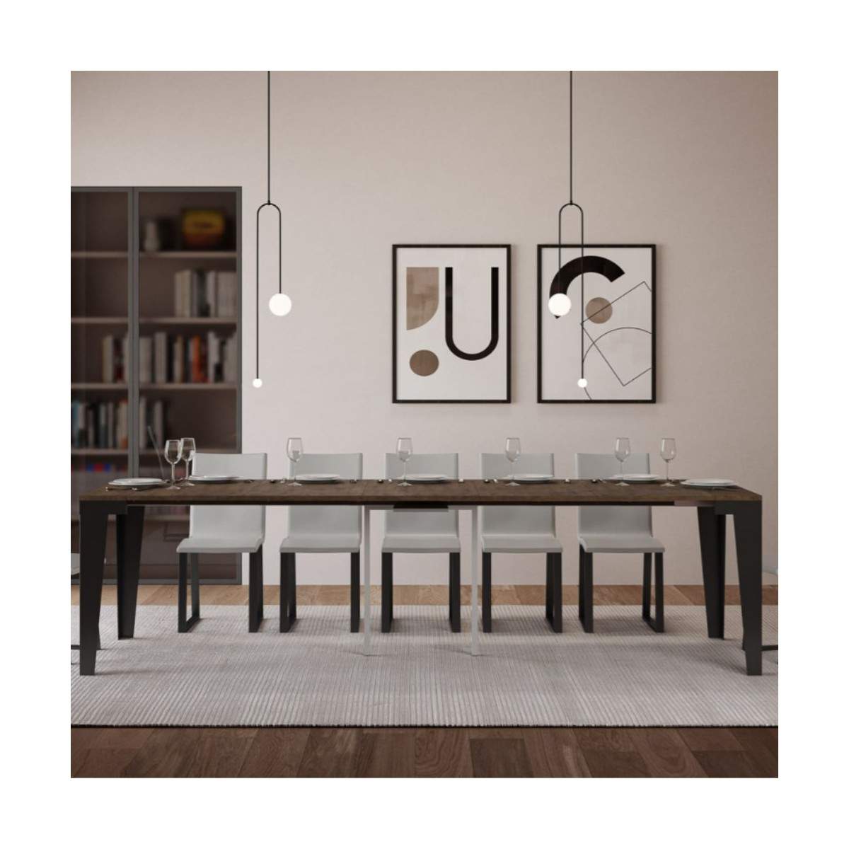 Chiusa, la consolle misura 90x40 cm con un’altezza di 77 cm, mantenendo un ingombro minimo e una linea pulita. Ma quando serve spazio in più, si trasforma rapidamente in un tavolo lungo fino a 300 cm, pronto per ospitare cene in compagnia, riunioni o progetti creativi.