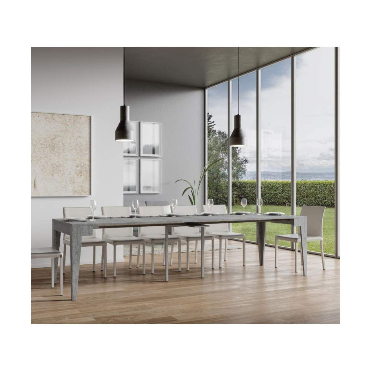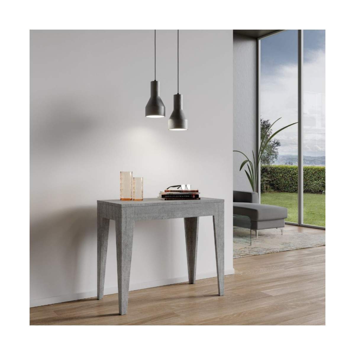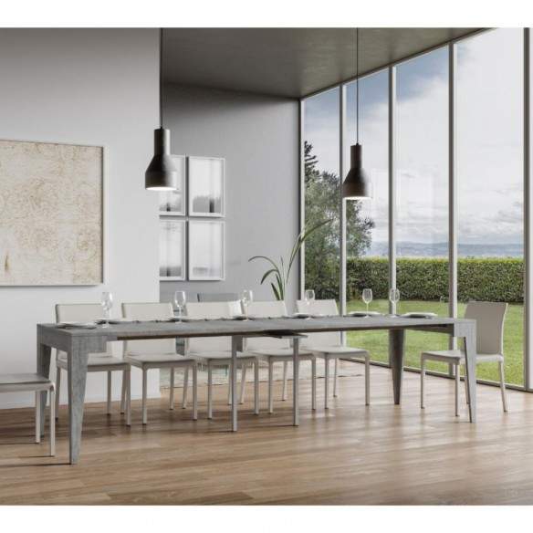 Quando aperta, la consolle si estende grazie a un sistema di allunghe pratico e robusto. Le allunghe, una volta chiusa la consolle, devono essere riposte separatamente, offrendo così una struttura snella e lineare quando non in uso.