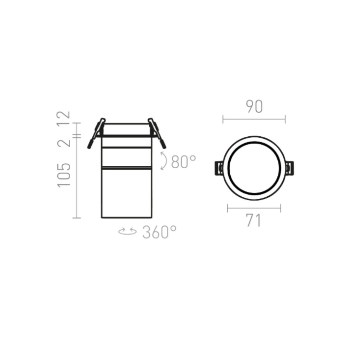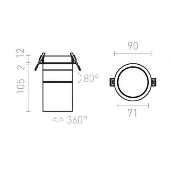Le dimensioni compatte — diametro 9 cm, altezza 10 cm, con foro di montaggio da 8,5 cm e profondità di incasso di 6 cm — ne facilitano l’installazione anche negli spazi più ridotti. Grazie all’angolo di inclinazione di 80° e alla rotazione di 350°, la direzionabilità della luce è massima, mentre l’angolo di luce di 36° consente di creare un fascio luminoso concentrato e preciso.