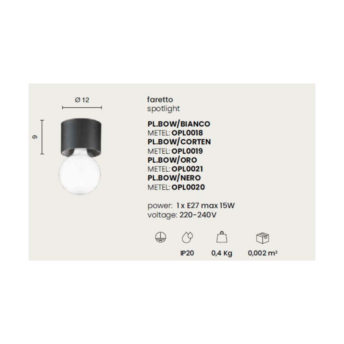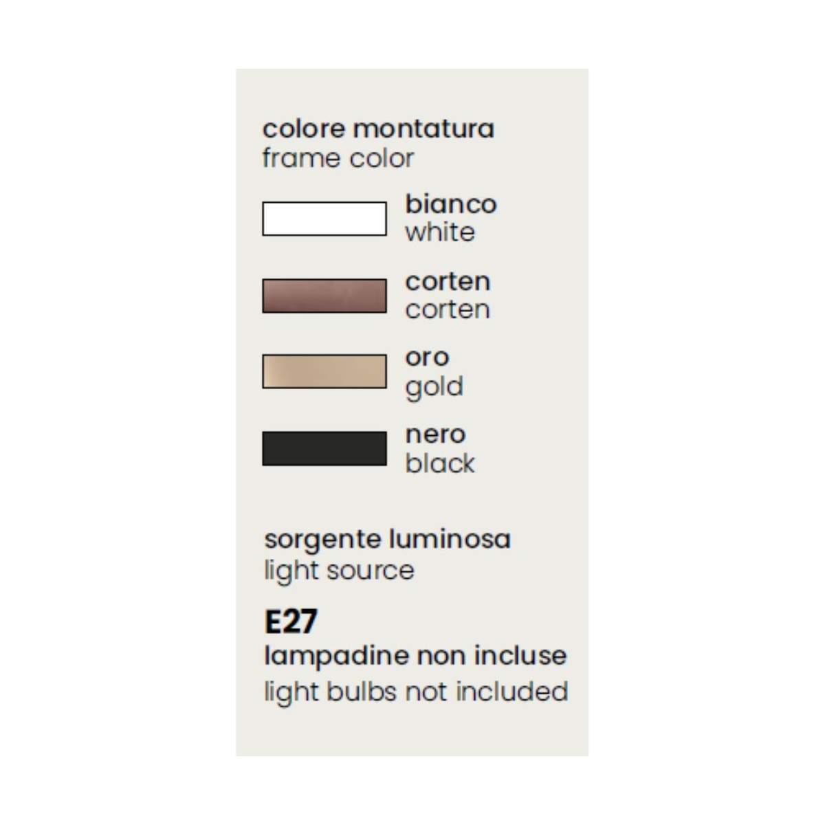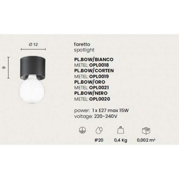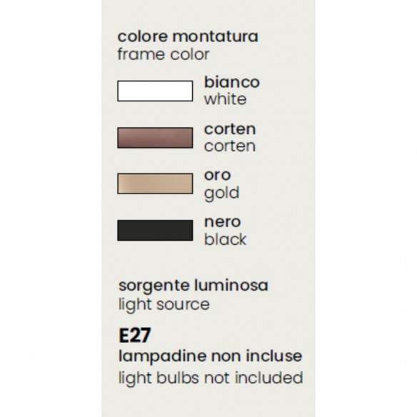 Disponibile in quattro finiture — bianco, corten, oro e nero — Bow si adatta a qualsiasi palette e stile d’arredo, diventando un dettaglio discreto ma di forte impatto visivo. Compatibile con una lampadina E27 (max 15W), ti permette di scegliere la sorgente luminosa perfetta per ogni esigenza, dal tono caldo e accogliente a quello più neutro e tecnico.