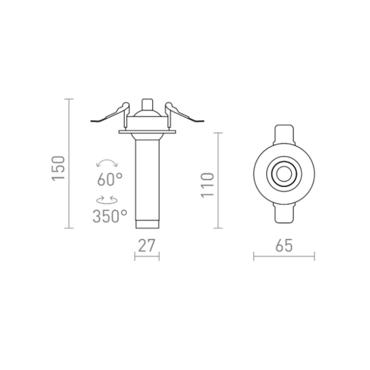Le dimensioni compatte — diametro 6,4 cm, lunghezza 11 cm, con foro di montaggio da 5,8 cm e profondità di incasso di 7 cm — lo rendono adatto anche a soffitti più sottili, offrendo un’installazione semplice e pulita. L’angolo di inclinazione di 35° e l’angolo di luce di 38° consentono di direzionare la luce con precisione, ideale per illuminare nicchie, dettagli d’arredo o creare punti luce mirati.