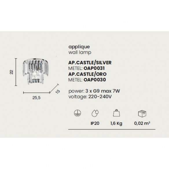 Perfetta per arricchire ingressi, corridoi o zone living con un tocco di stile regale, Castle è più di una semplice applique: è un gioiello luminoso da esibire sulle pareti.