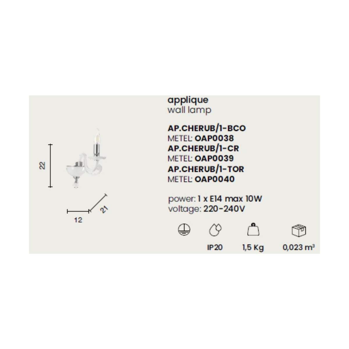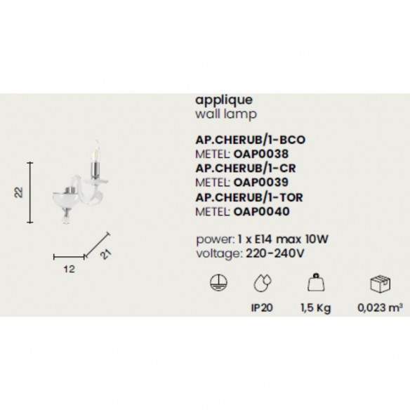 La lampada a parete CHERUBINI nasce dall'incontro tra vetro lavorato a mano e cristallo ottico, per regalare alla luce un effetto brillante e raffinato. Un complemento pensato per chi ama i dettagli classici rivisitati in chiave elegante e contemporanea.