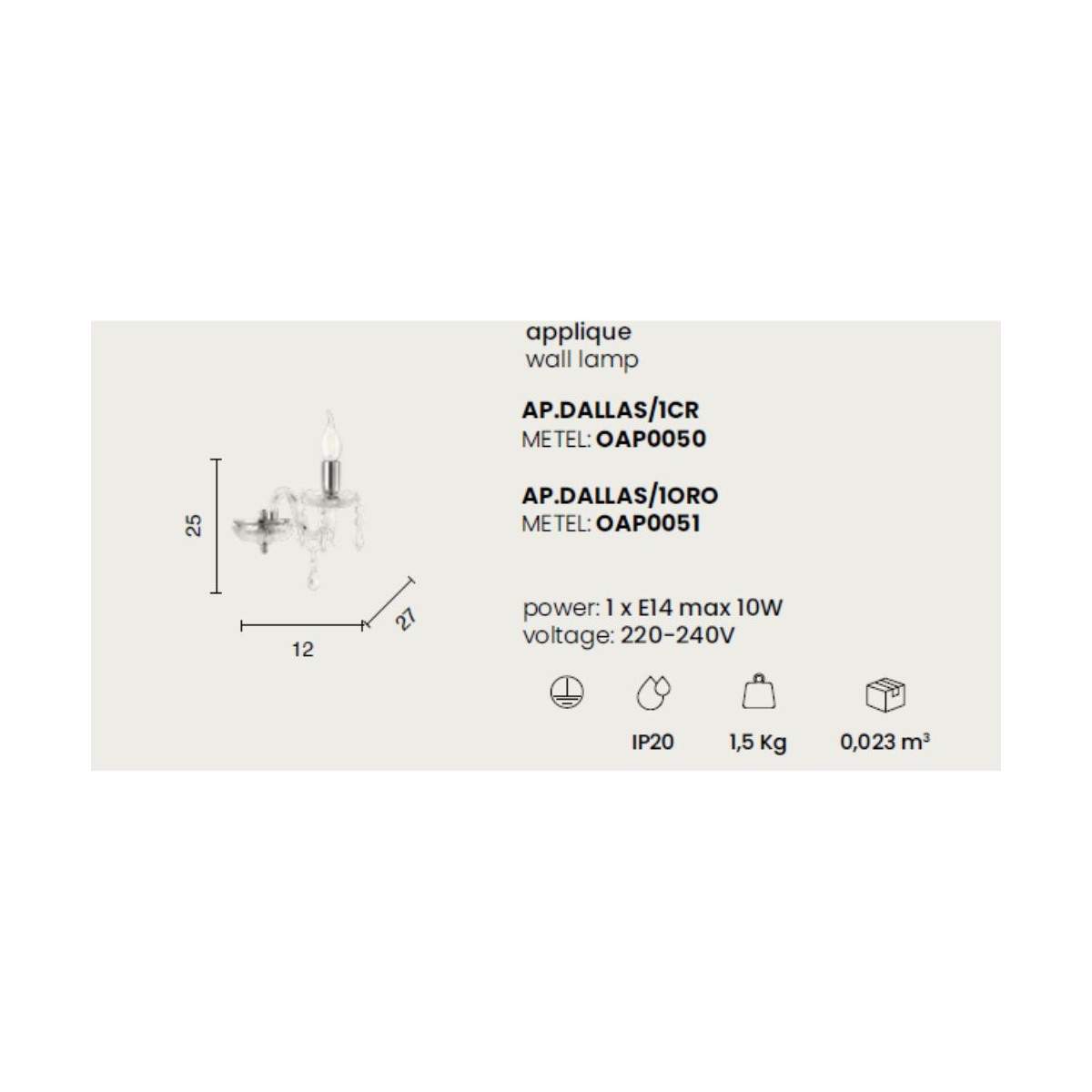 Materiali: Vetro e cristallo trasparente – Finiture: Cromo o Oro Attacco: E14 / E27 (lampadine non incluse) – 220–240V