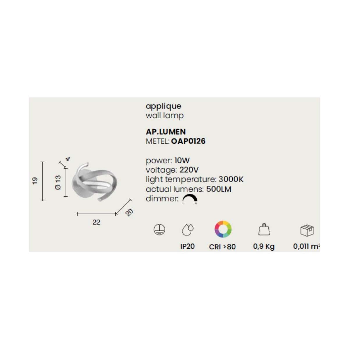 Compatta nelle dimensioni — 19 cm di altezza e 22 cm di larghezza — è perfetta per illuminare corridoi, soggiorni o camere da letto con discrezione e carattere, diventando un complemento d’arredo che arricchisce la parete con la sua presenza essenziale.