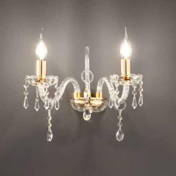 Lampada a parete MARIA TERESA T4 in vetro lavorato a mano con finiture oro e cristalli trasparenti.