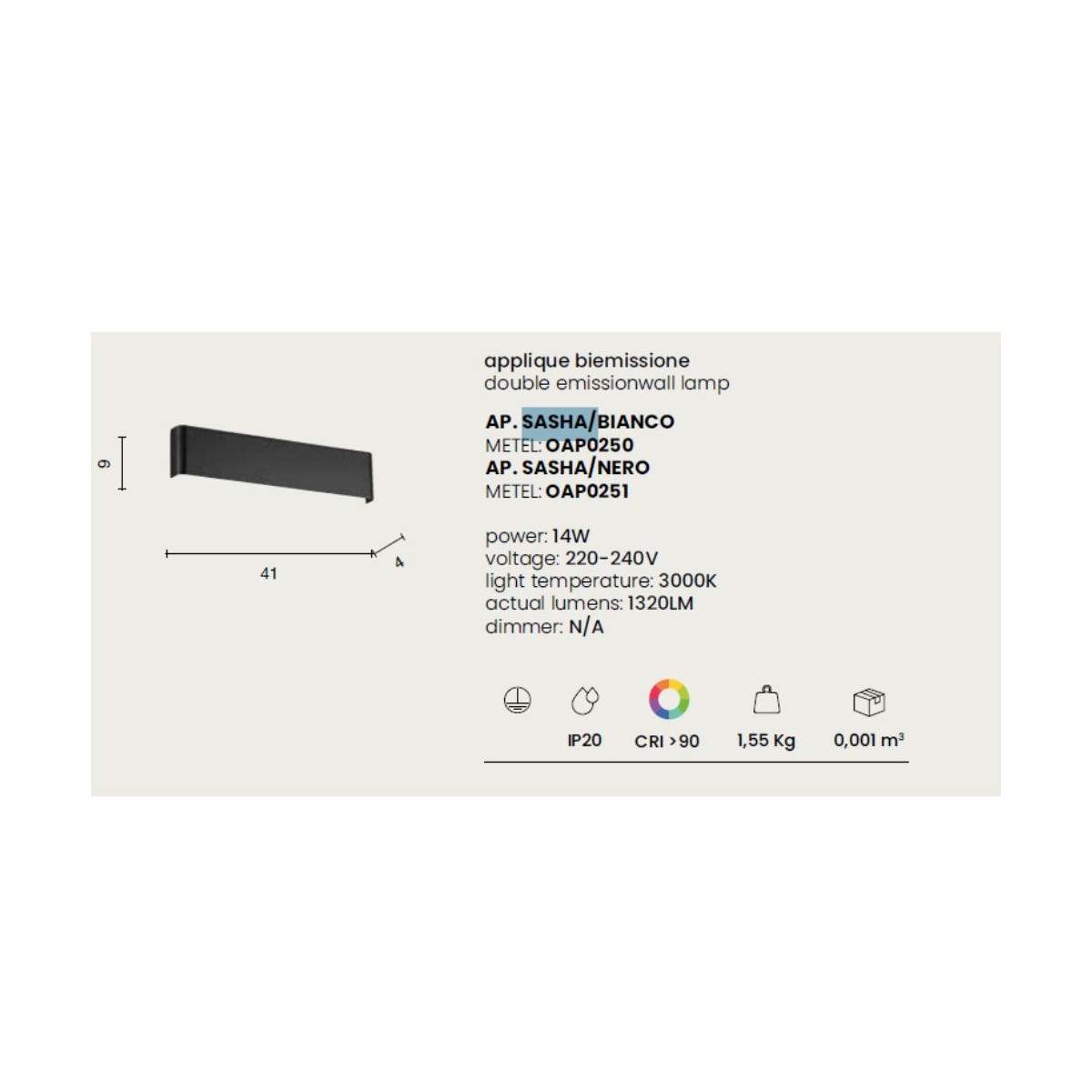 Il diffusore in policarbonato assicura una luce morbida e omogenea, con temperatura calda da 3000K, ideale per creare un’atmosfera accogliente e rilassante. Con una potenza di 14W e 1320 lumen effettivi, Sasha offre il giusto equilibrio tra intensità luminosa e risparmio energetico.