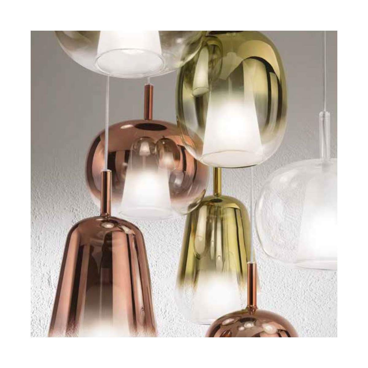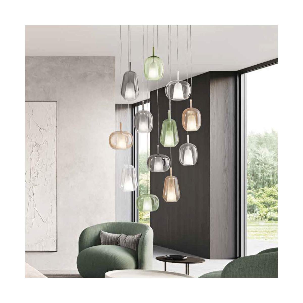 Thelma è la lampada a soffitto che celebra la leggerezza del vetro soffiato e la libertà di creare soluzioni luminose su misura. Il suo design modulare si sviluppa attraverso tre eleganti diffusori dalle forme morbide e organiche — ovale, goccia e tondeggiante — ciascuno caratterizzato da una raffinata doppia finitura: vetro satinato all’interno per una luce soffusa e uniforme, vetro colorato all’esterno per un tocco deciso e contemporaneo.