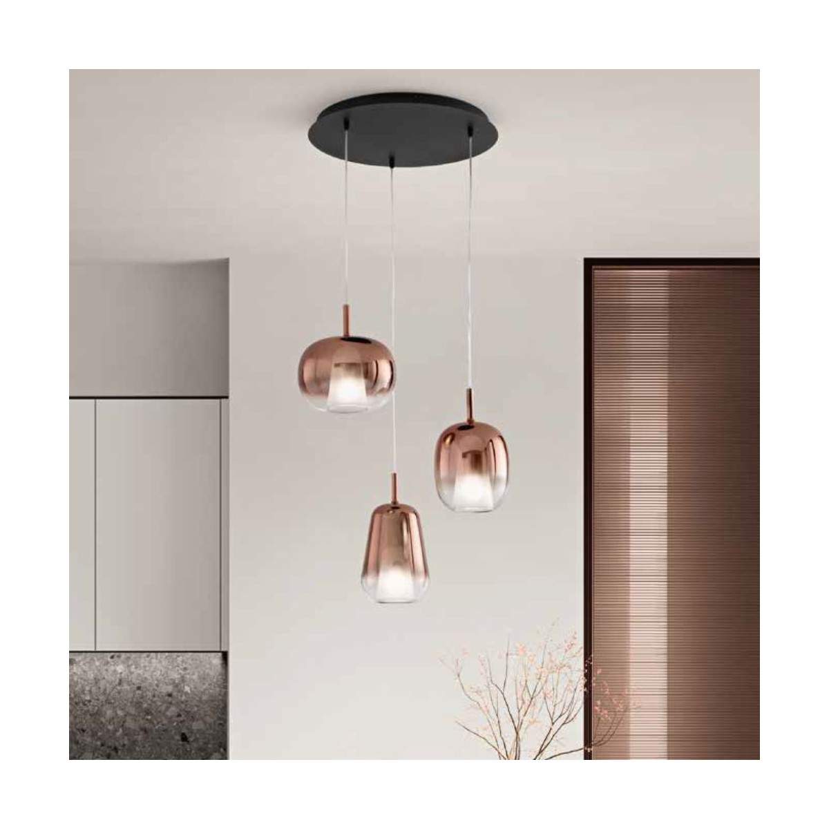 Un pratico tappino in materiale polimerico mantiene il cavo perfettamente centrato, mentre i fili regolabili permettono di scegliere l’altezza ideale per valorizzare ogni ambiente, dalla cucina al soggiorno, fino alla zona notte.