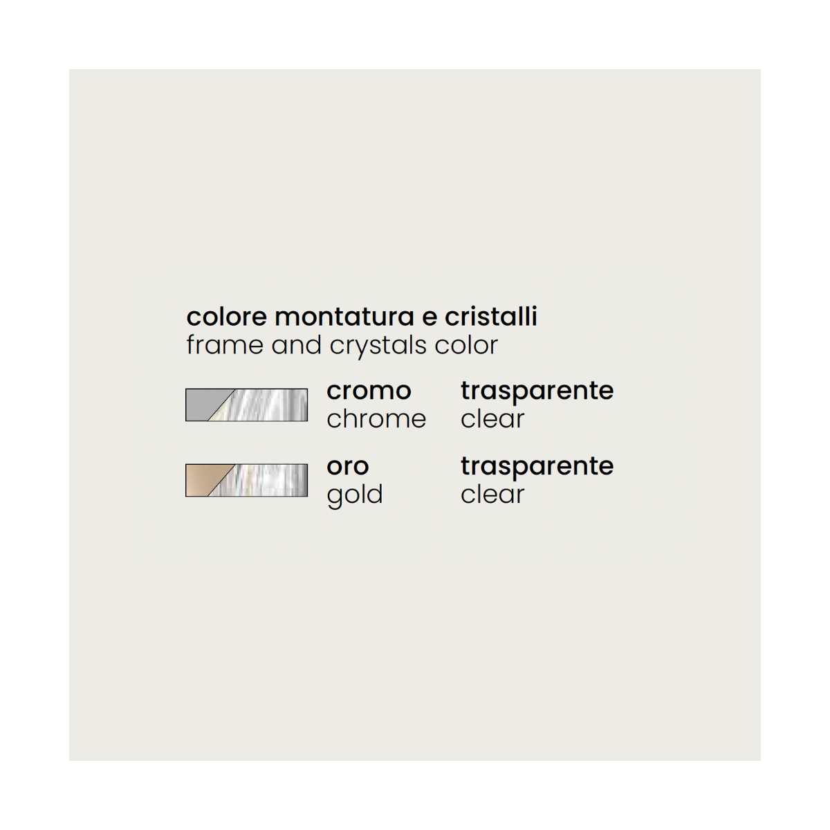 Disponibile in due eleganti finiture – oro/trasparente o cromo/trasparente – BACH si presenta in due misure pensate per adattarsi a diverse esigenze: