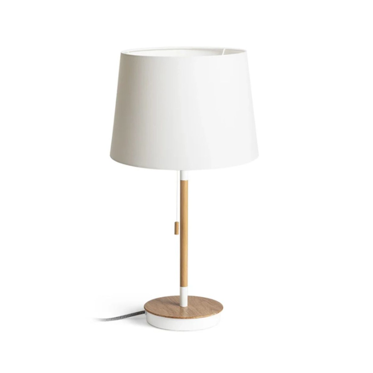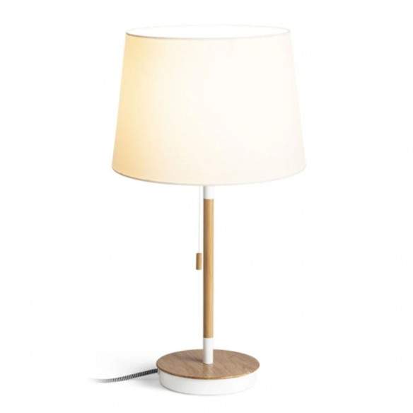 Lampada da tavolo KEITH/ AMBITUS con paralume in tessuto e porta USB integrata nella base. La base è in finto faggio con dettagli laccati in bianco.