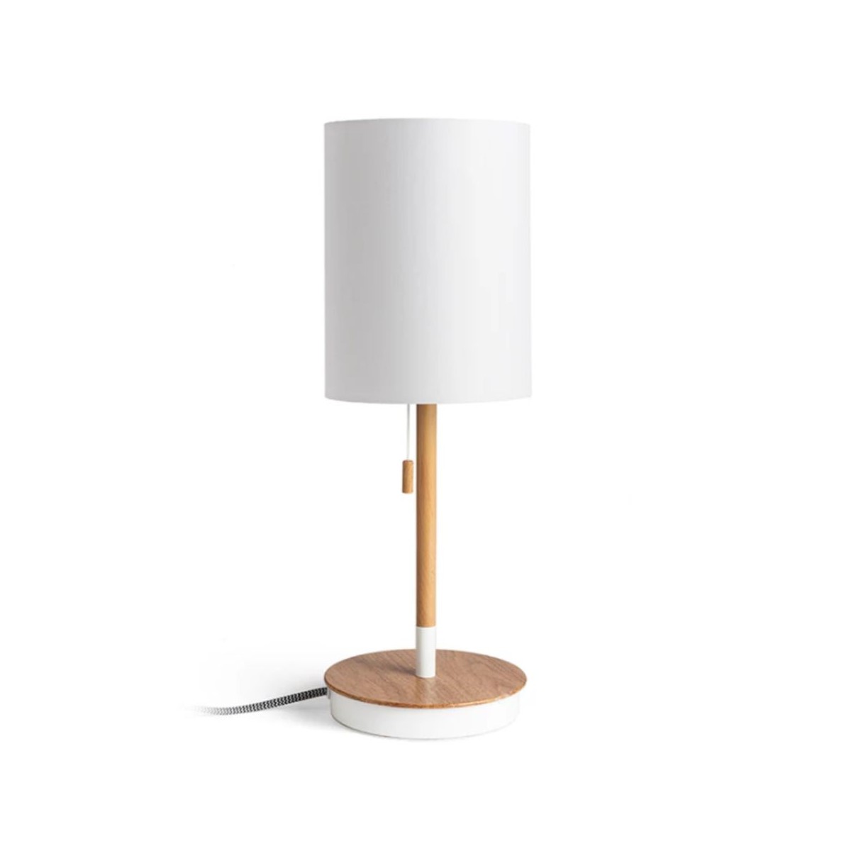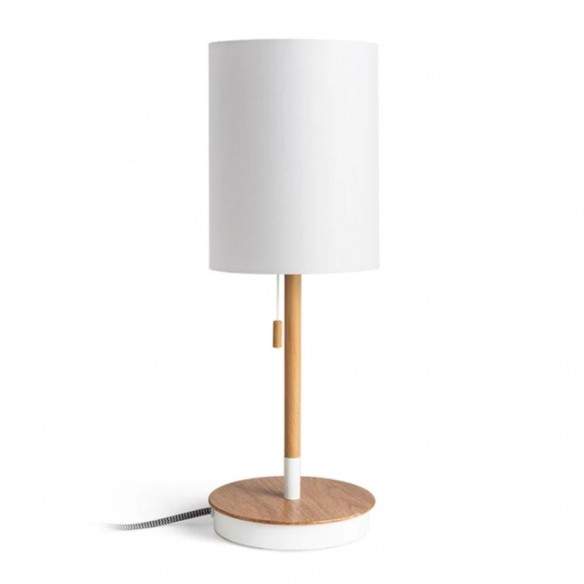 Il paralume in tessuto diffonde una luce calda e avvolgente, mentre la base in imitazione faggio con dettagli laccati in bianco aggiunge eleganza e un tocco moderno.