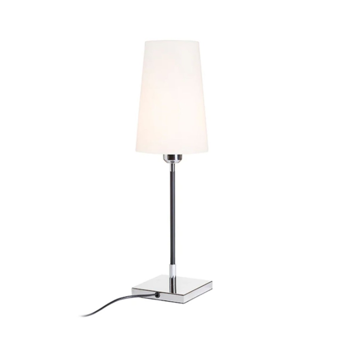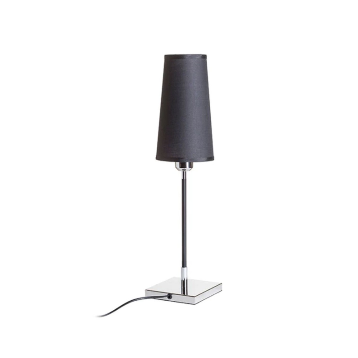 Lampada da tavolo LULU con paralume conico di tessuto e con filettatura E27. La base è una combinazione elegante di parte cromata e colore nero.