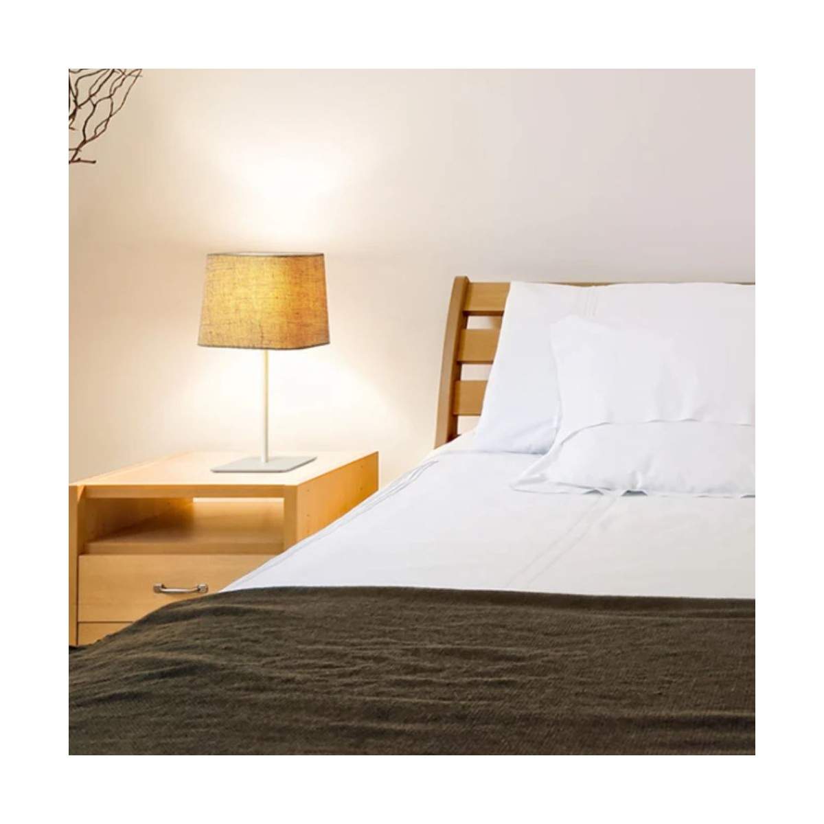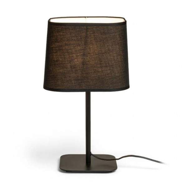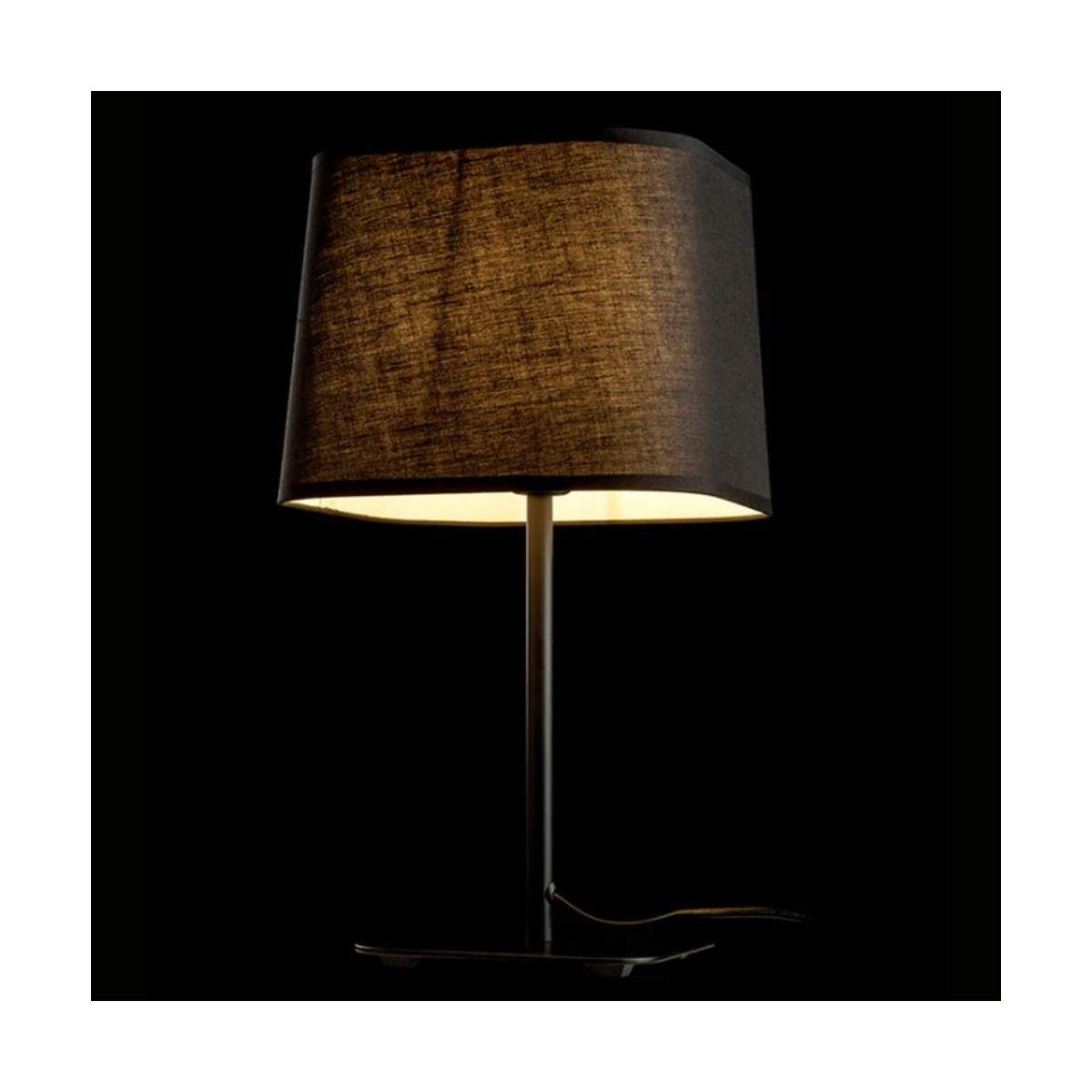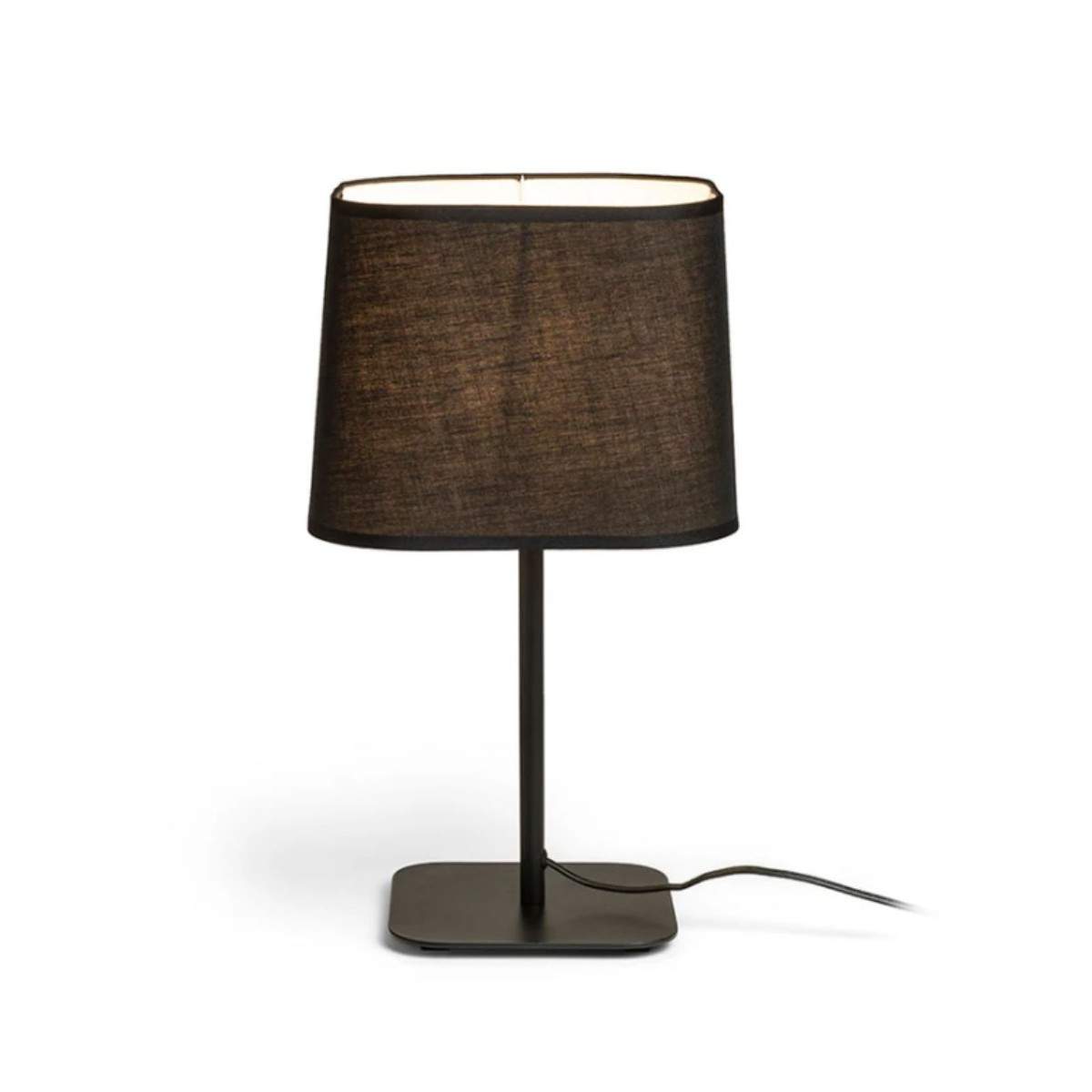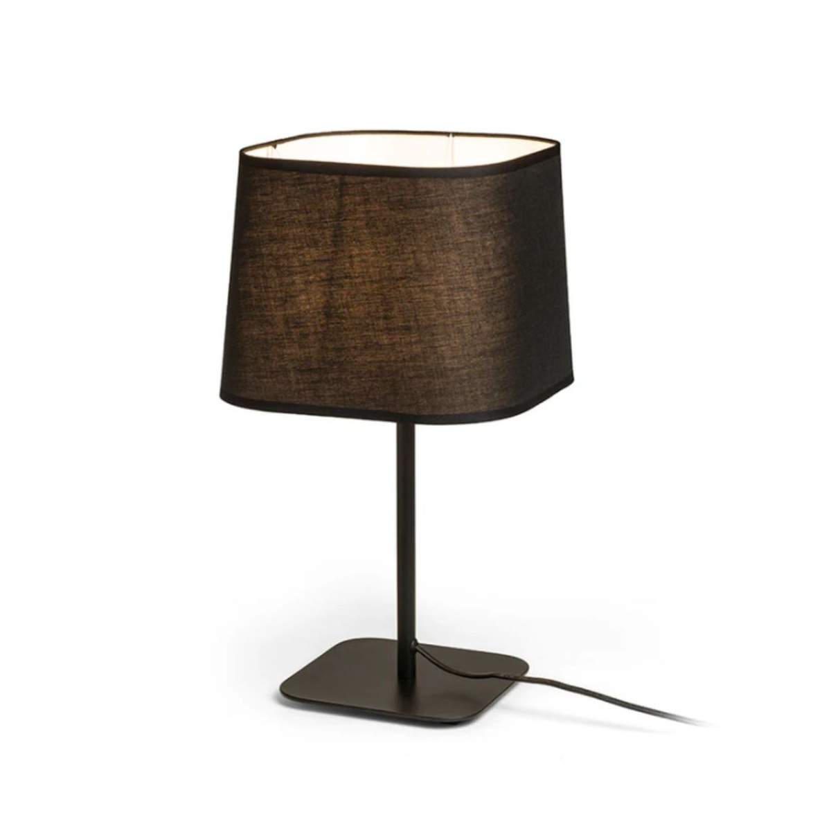 Il paralume tessile dalla forma quadrata diffonde una luce morbida e avvolgente, perfetta per creare atmosfera su comodini, madie o scrivanie, mentre il piedistallo metallico dona solidità e un tocco contemporaneo al design.