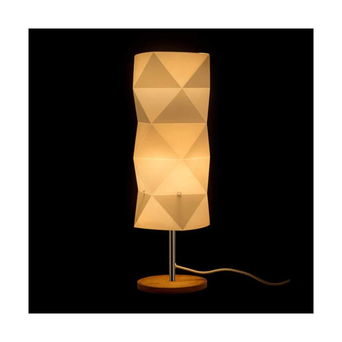 Il piedistallo in legno dona calore all’ambiente, mentre il paralume in plastica garantisce una diffusione della luce uniforme e piacevole, ideale per l’uso quotidiano.