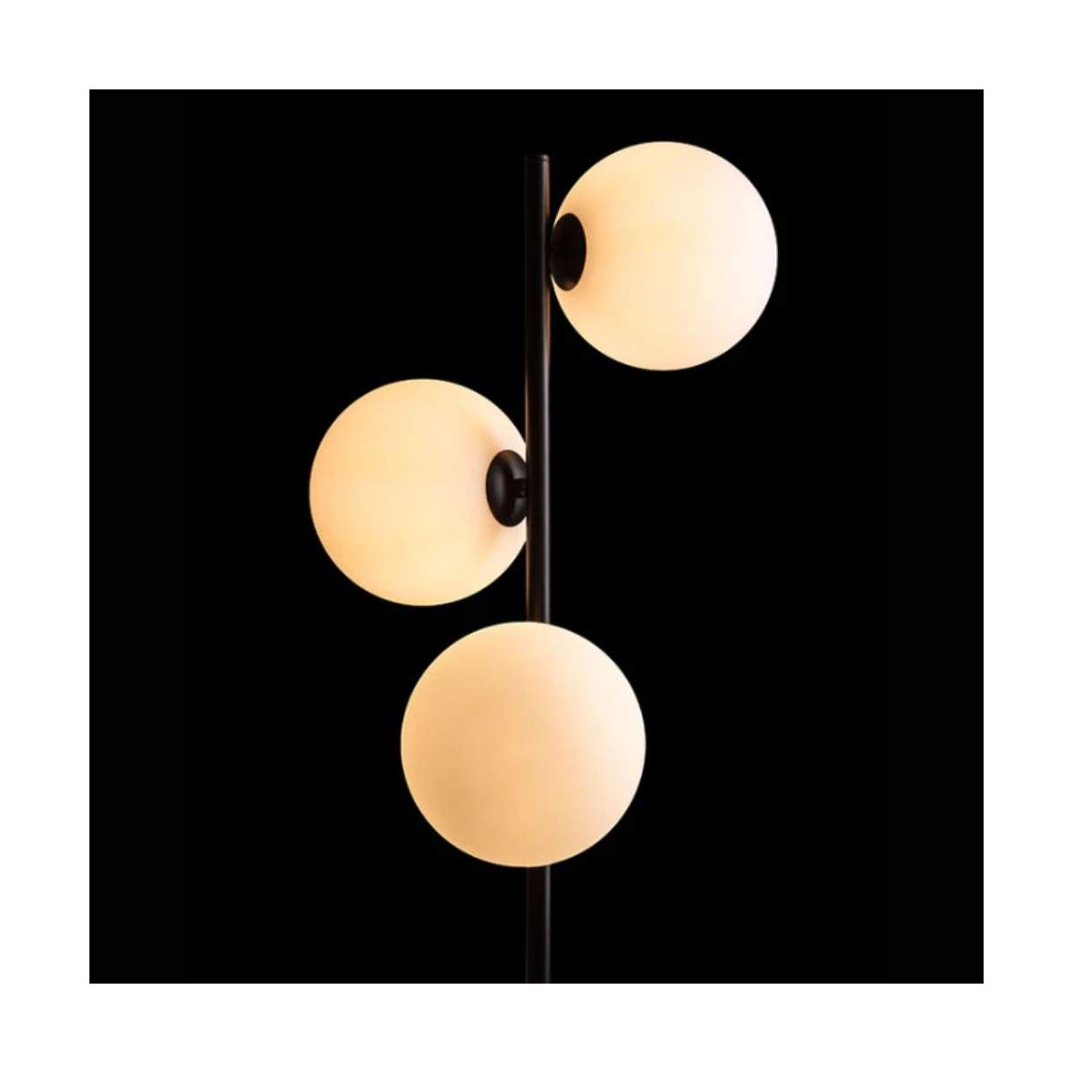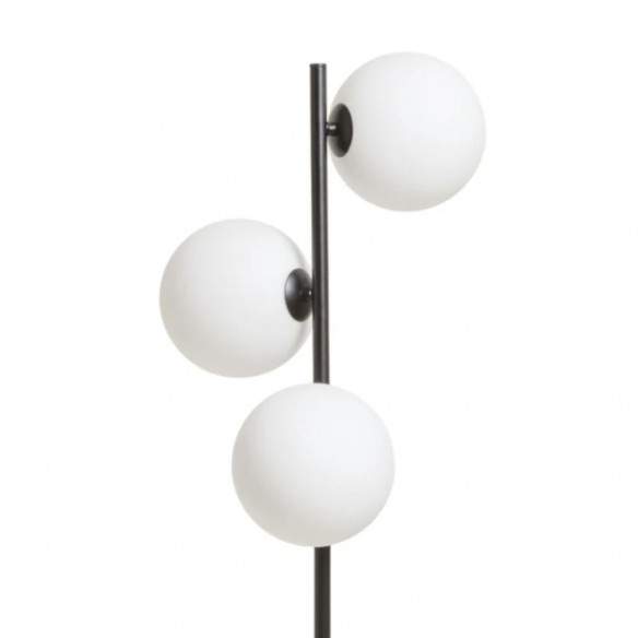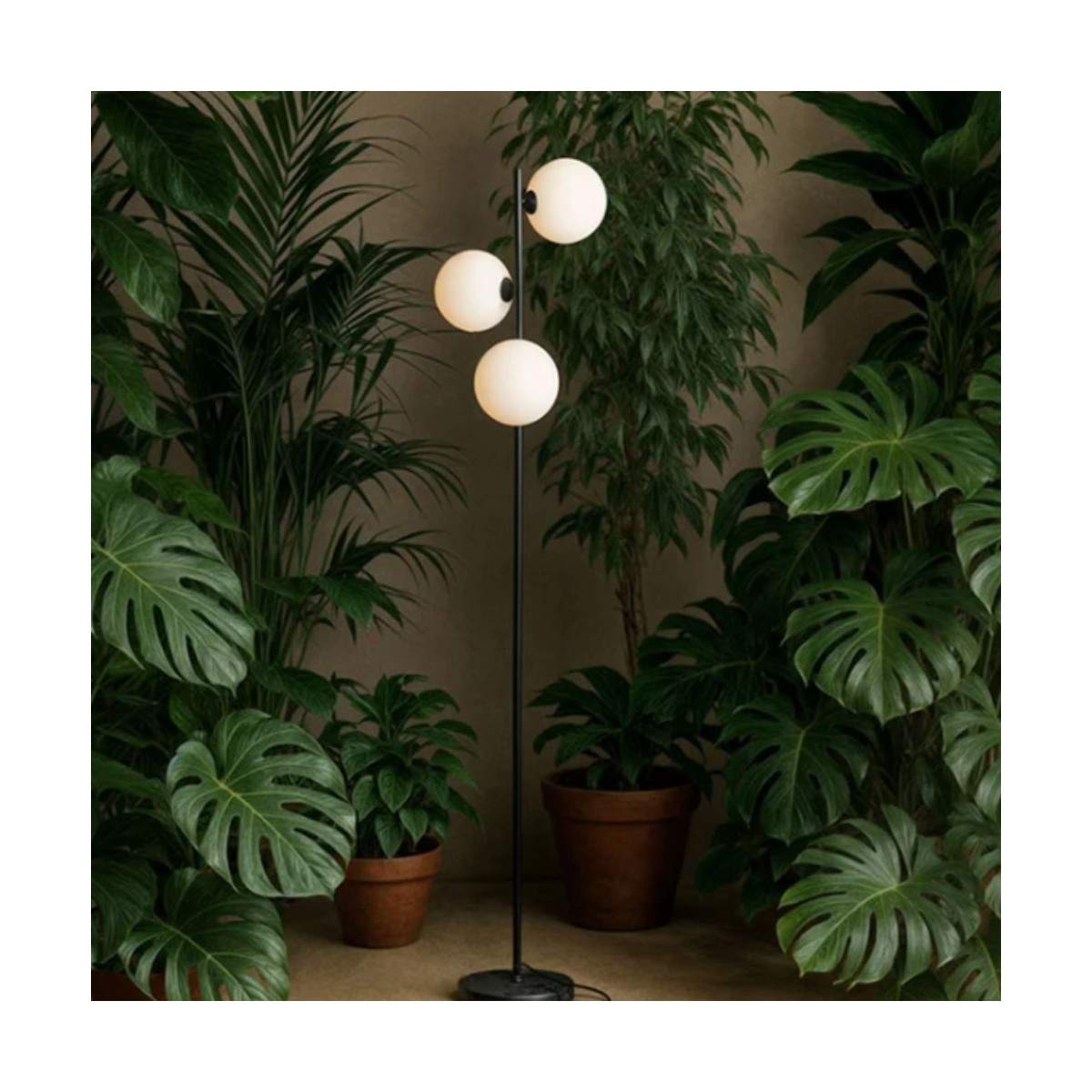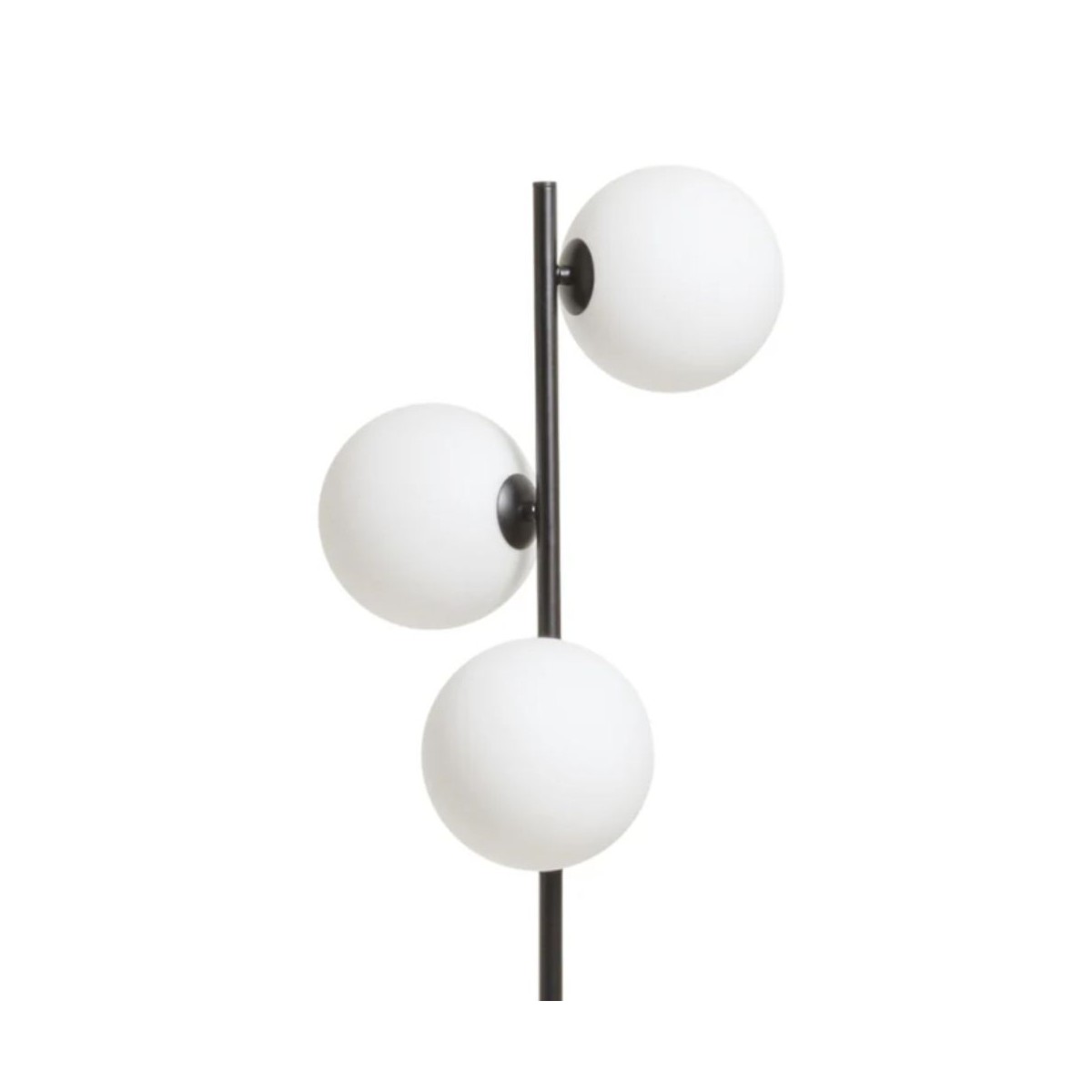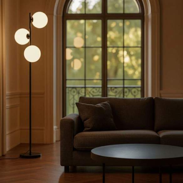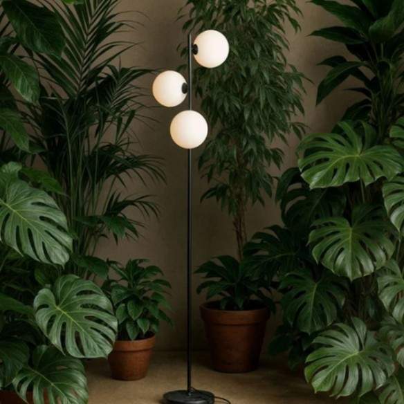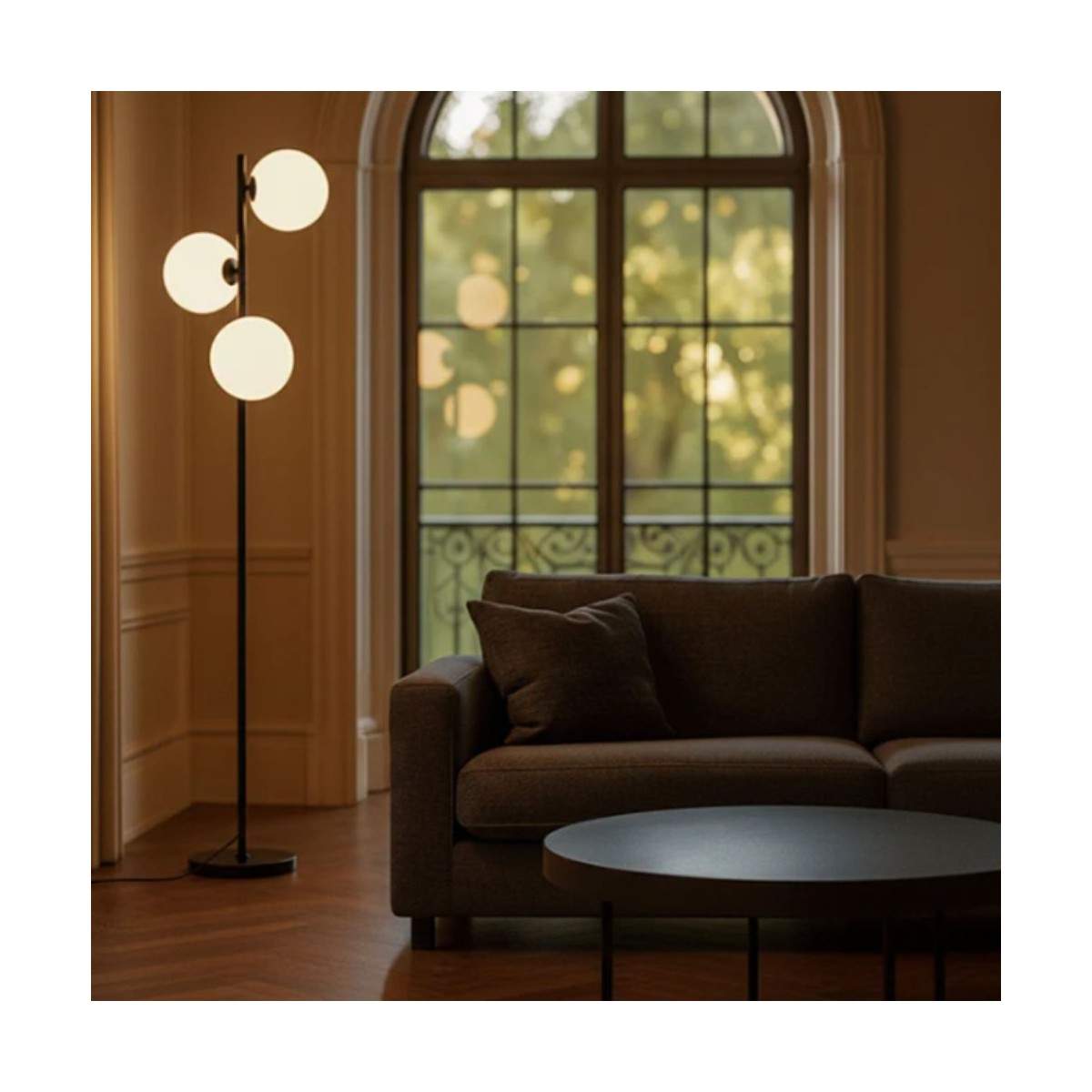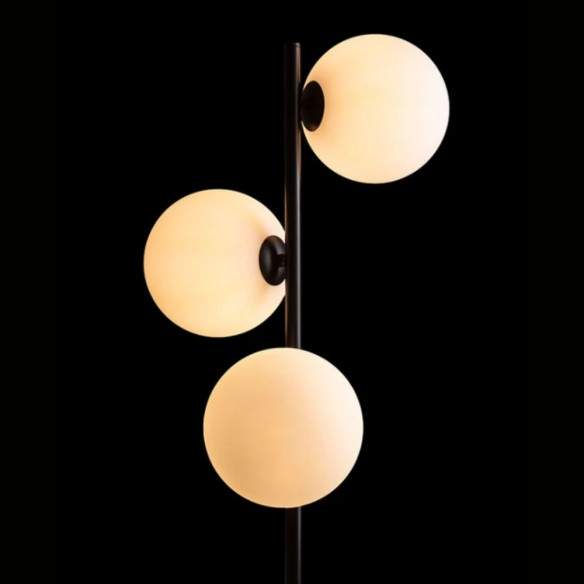 I tre paralumi in vetro opalino diffondono la luce in modo morbido e uniforme, creando un’atmosfera calda e accogliente, mentre la base laccata nera aggiunge un dettaglio di stile moderno e discreto.