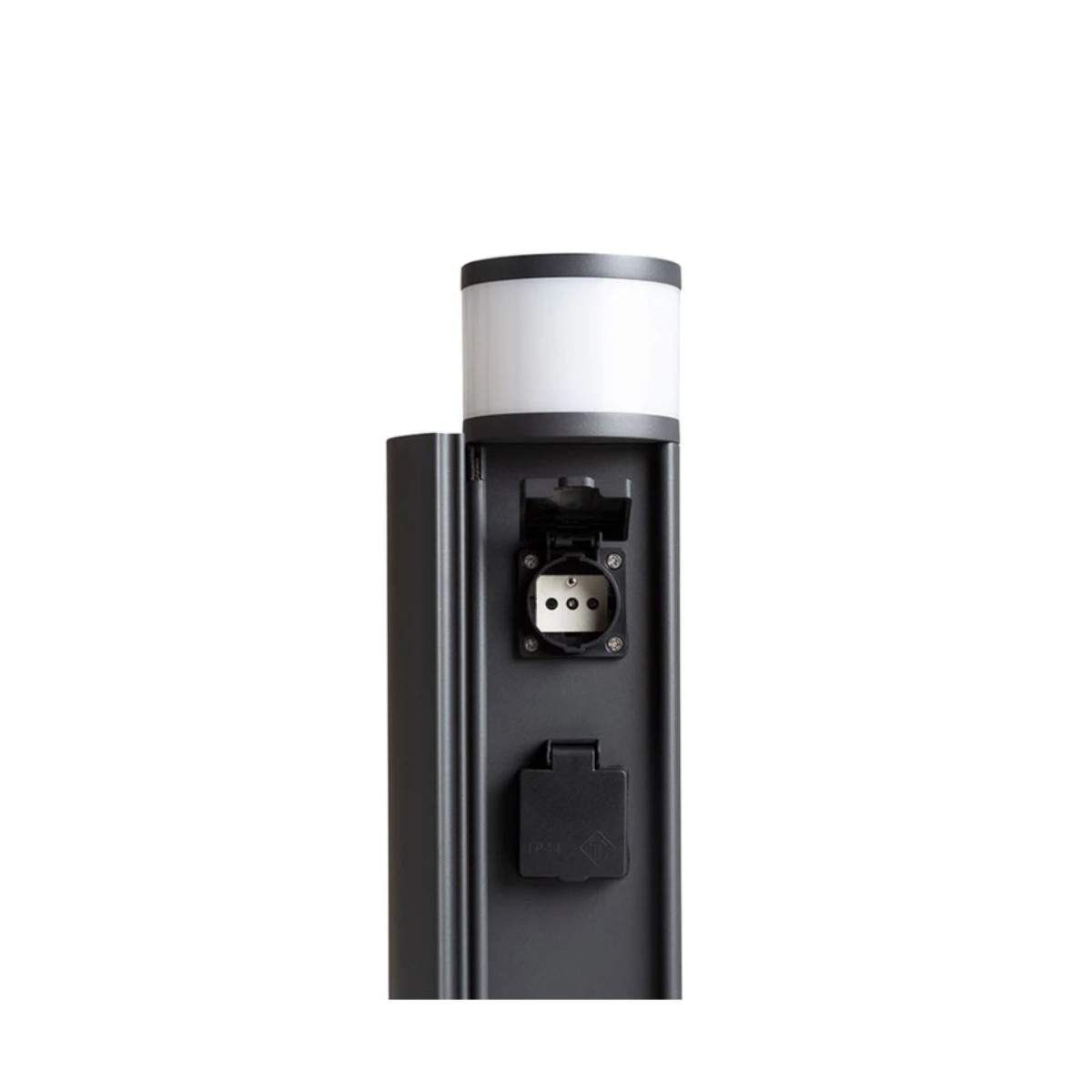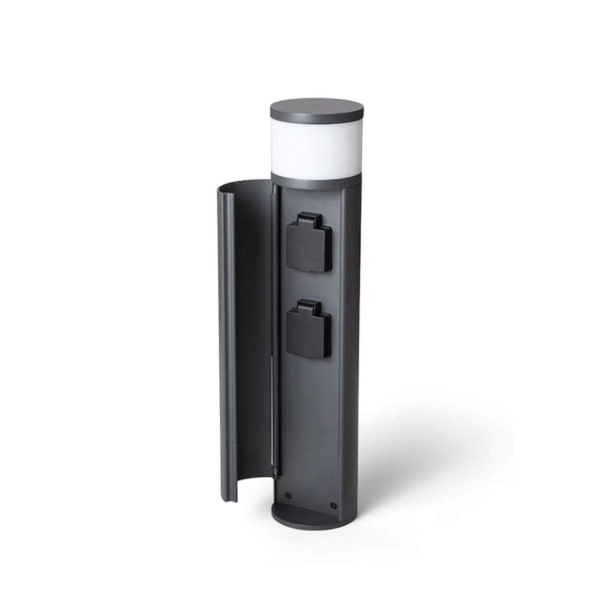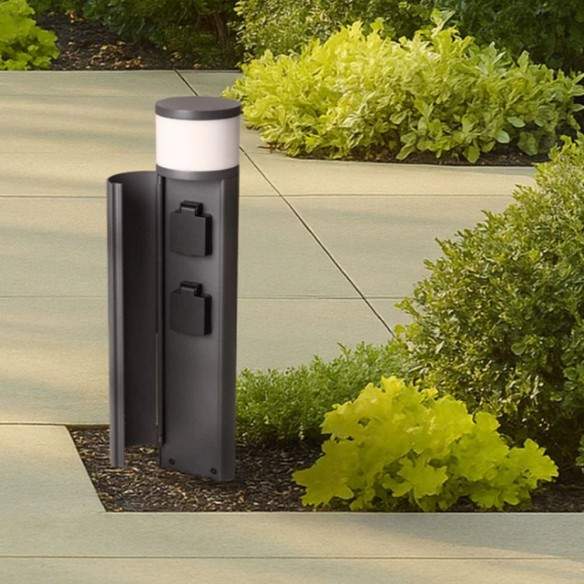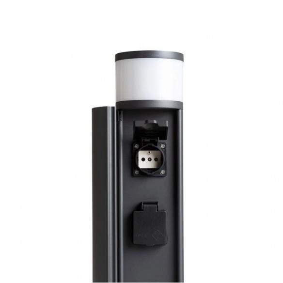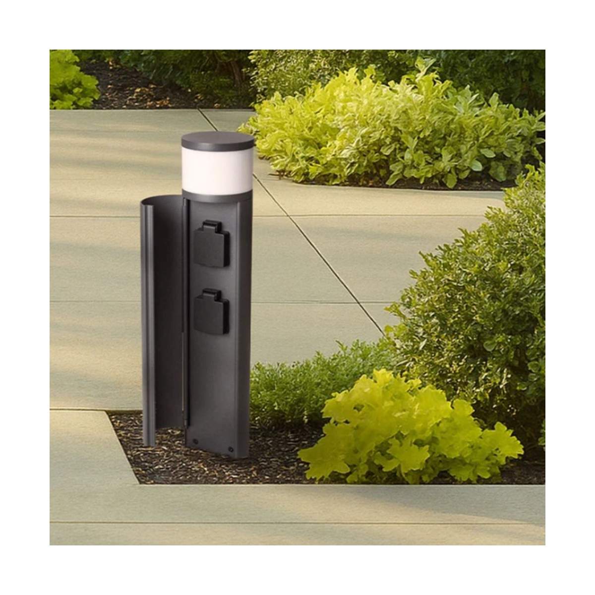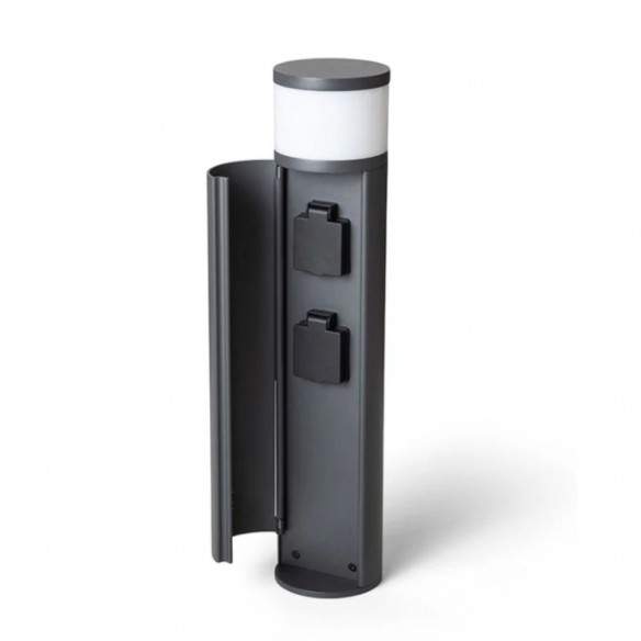 Oltre alla sorgente luminosa, integra due prese elettriche di tipo E, sapientemente nascoste all’interno del corpo lampada dietro un coperchio apribile, ideali per collegare dispositivi da esterno in modo discreto e ordinato.
