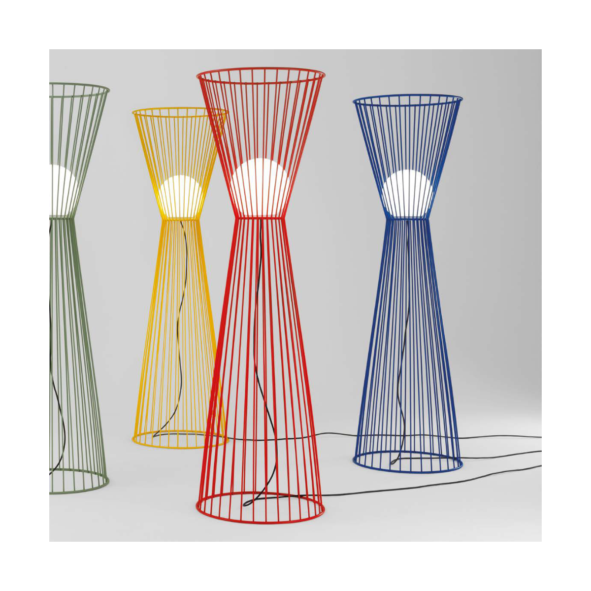 Lampada da terra LUNAPIENA con struttura in tondino d'acciaio disponibile in diverse colorazioni.
